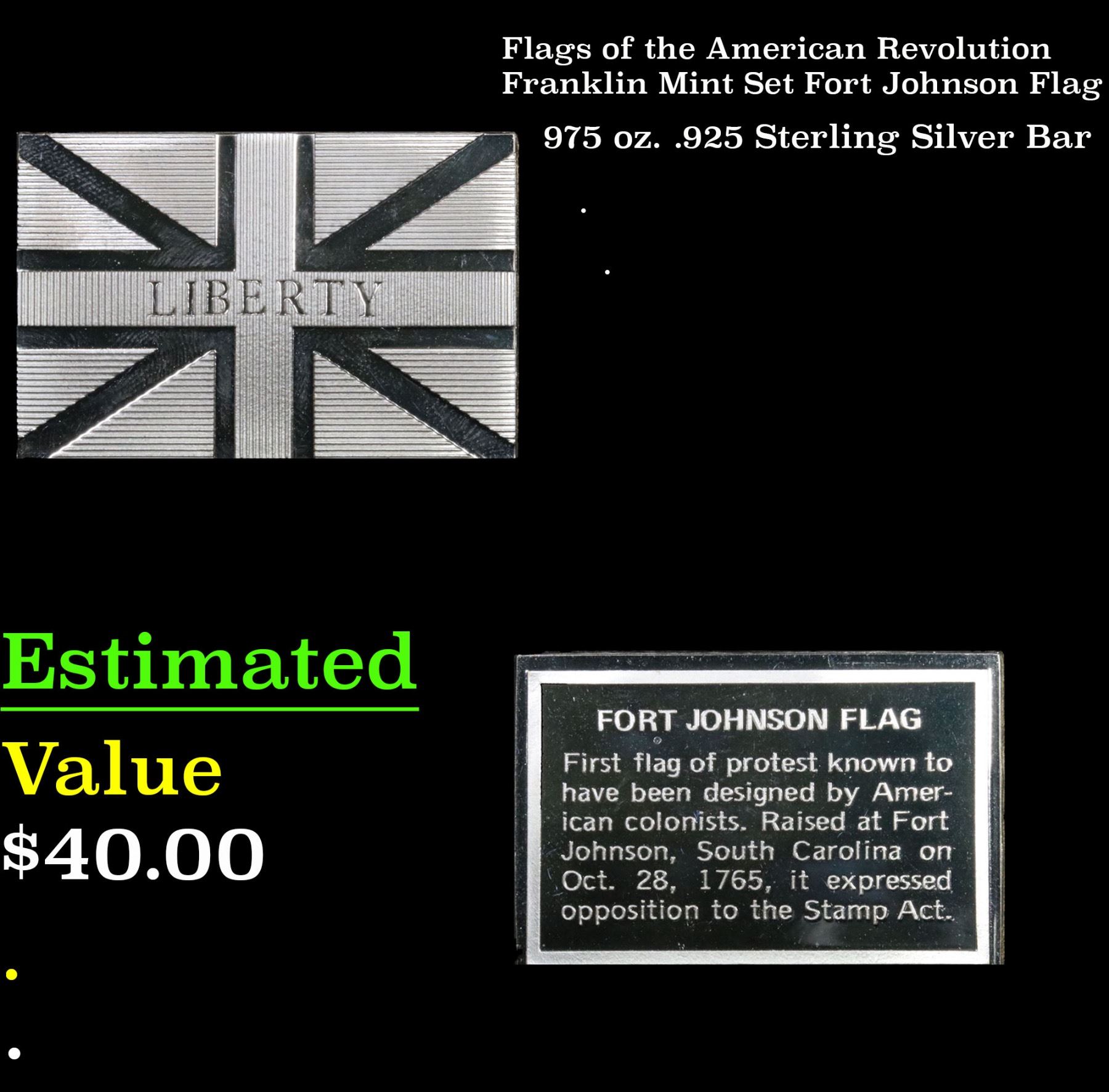 Flags of the American Revolution Franklin Mint Set Fort Johnson Flag . . 415 Grams Sterling Silver. This vintage Franklin Mint set includes 64 pieces. We will be bringing the entire set to you throughout all of our Fall Extravaganza auction. This Set of 64 ingots represents different flags of American soldiers during the Revolutionary War . This ingot is "Fort Johnson" Flag. It is 415 grams of Sterling Silver. Each piece is more beautiful than the next. A truly wonderful collection. This is a rare and highly sought after collectible.