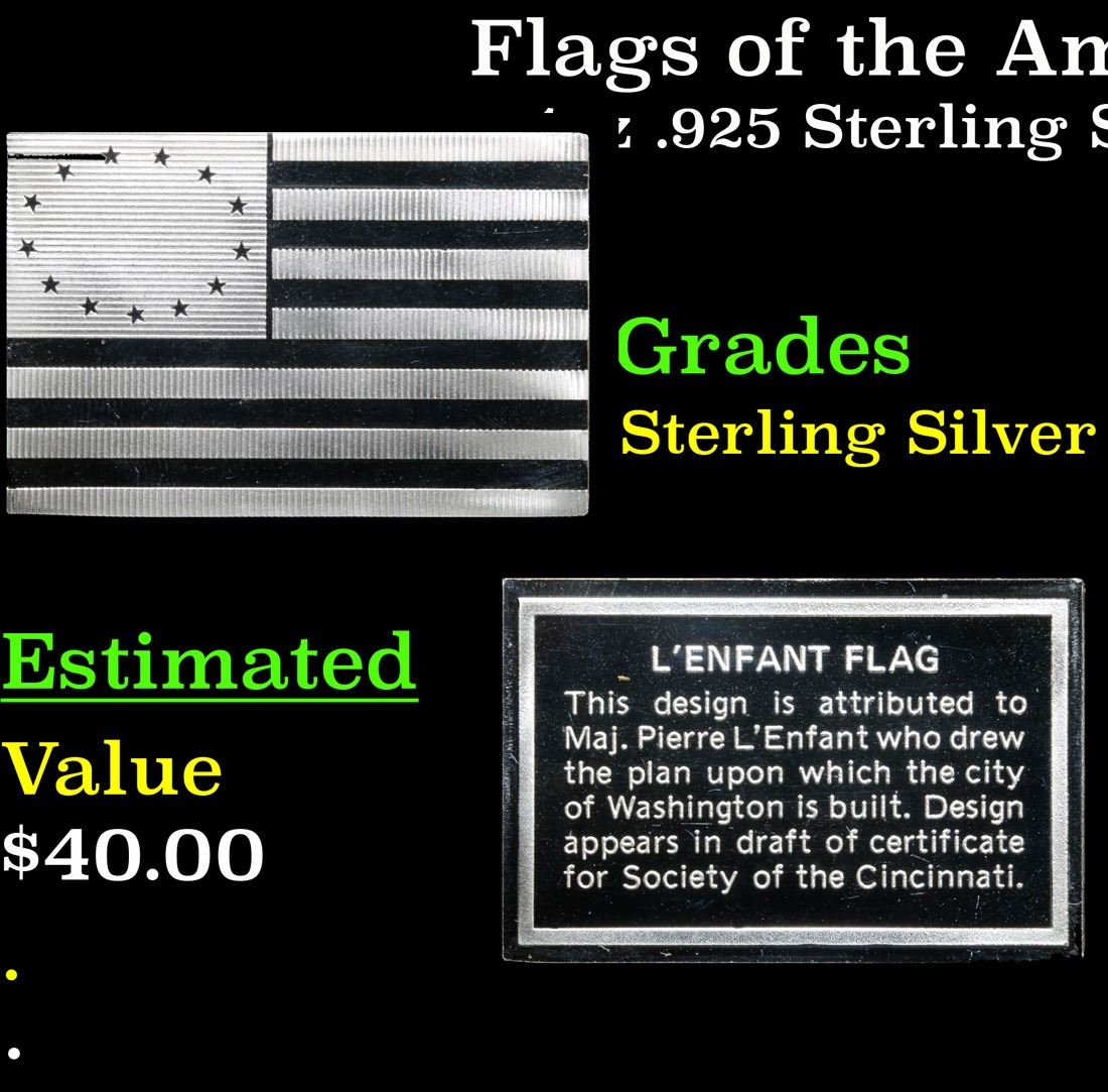 Flags of the American Revolution L'enfant Flag . . 1oz .925 Sterling Silver Bar Grades. This vintage Franklin Mint set includes 64 pieces. We will be bringing the entire set to you throughout all of our Fall Extravaganza auction. This Set of 64 ingots represents different flags of American soldiers during the Revolutionary War . This ingot is "L'enfant" flag. It is 415 grains of Sterling Silver. Each piece is more beautiful than the next. A truly wonderful collection. This is a rare and highly sought after collectible.