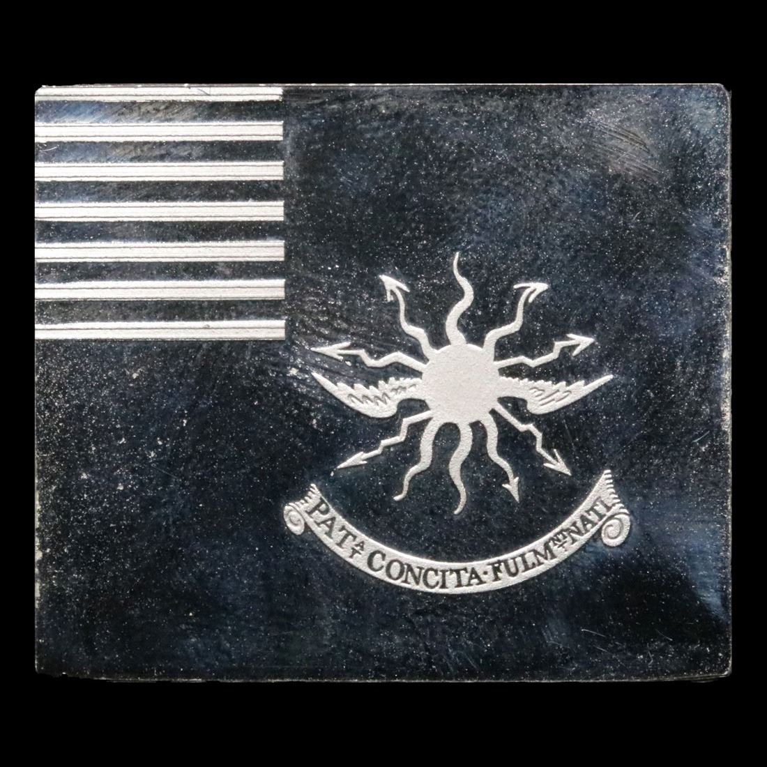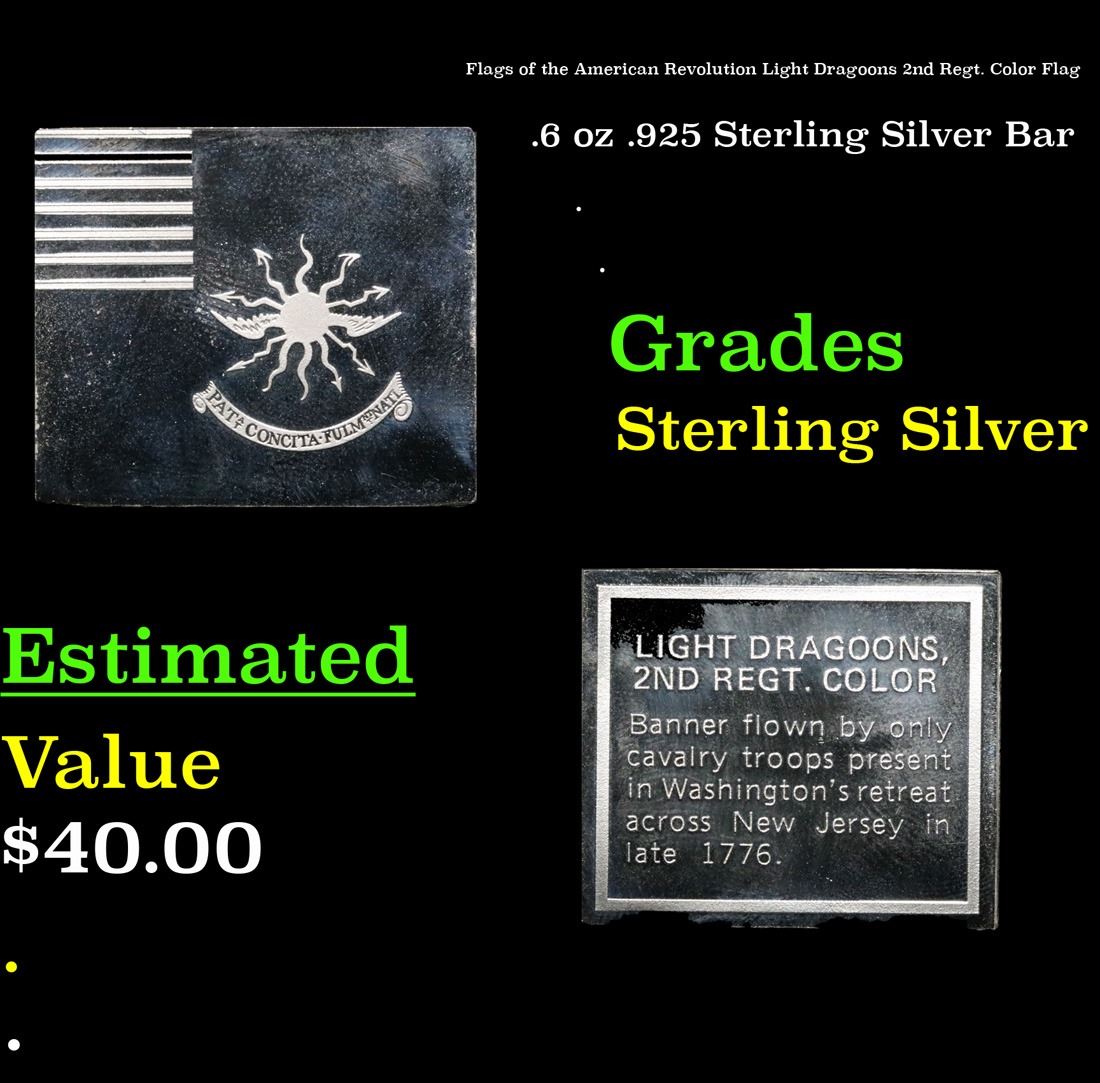 Flags of the American Revolution Light Dragoons 2nd Regt. Color Flag . . .6 oz .925 Sterling Silver Bar Grades. This vintage Franklin Mint set includes 64 pieces. We will be bringing the entire set to you throughout all of our Fall Extravaganza auction. This Set of 64 ingots represents different flags of American soldiers during the Revolutionary War . This ingot is "Light Dragoons 2nd Regt. Color" flag. It is 320 grains of Sterling Silver. Each piece is more beautiful than the next. A truly wonderful collection. This is a rare and highly sought after collectible.