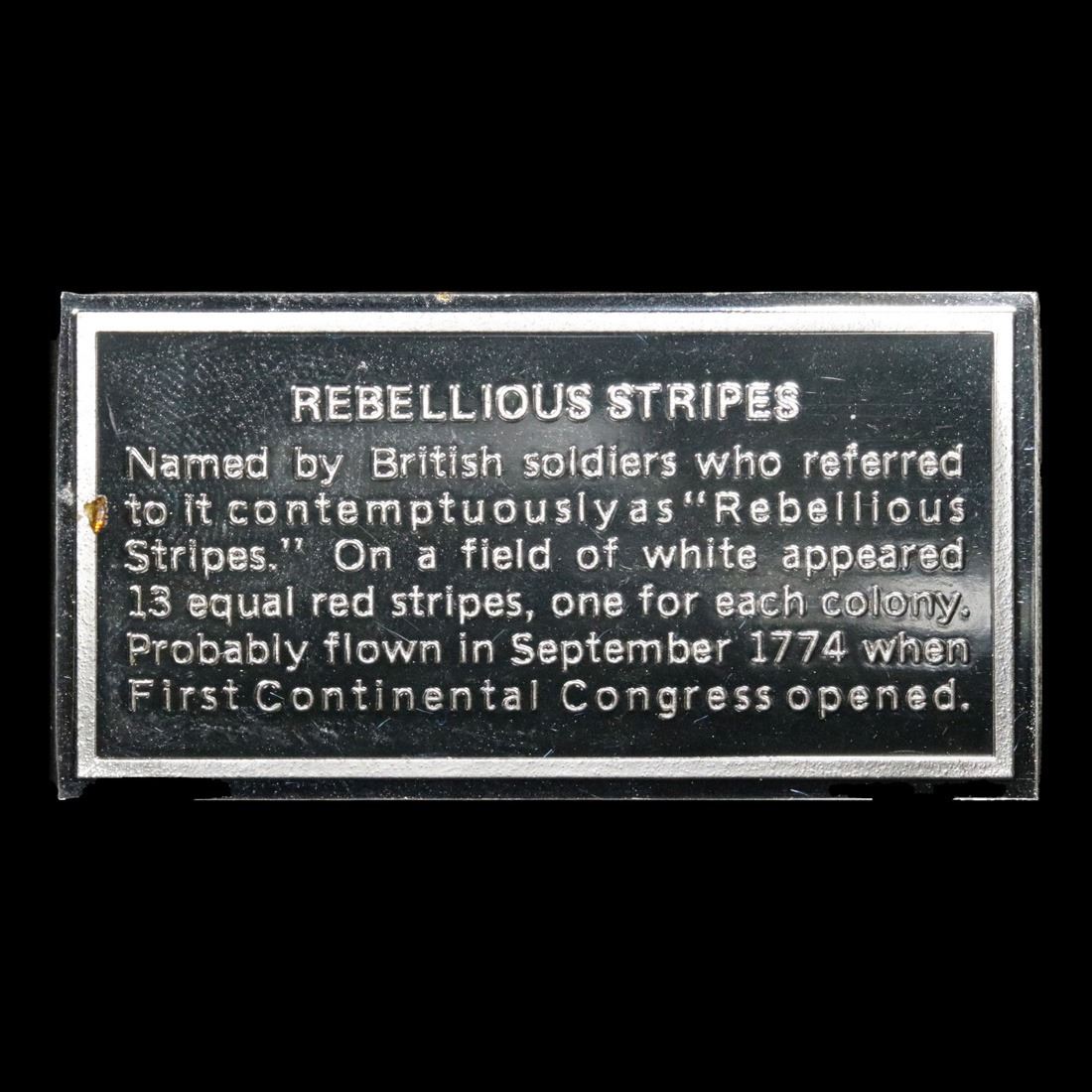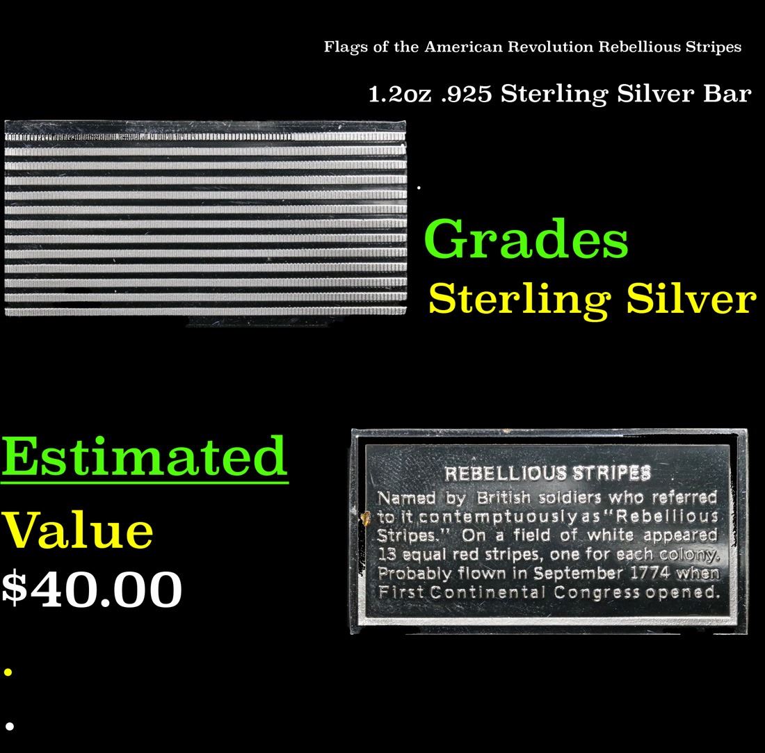 Flags of the American Revolution Rebellious Stripes . . 1.2oz .925 Sterling Silver Bar Grades. This vintage Franklin Mint set includes 64 pieces. We will be bringing the entire set to you throughout all of our Fall Extravaganza auction. This Set of 64 ingots represents different flags of American soldiers during the Revolutionary War . This ingot is "Rebellious Stripes" flag. It is 530 grains of Sterling Silver. Each piece is more beautiful than the next. A truly wonderful collection. This is a rare and highly sought after collectible.