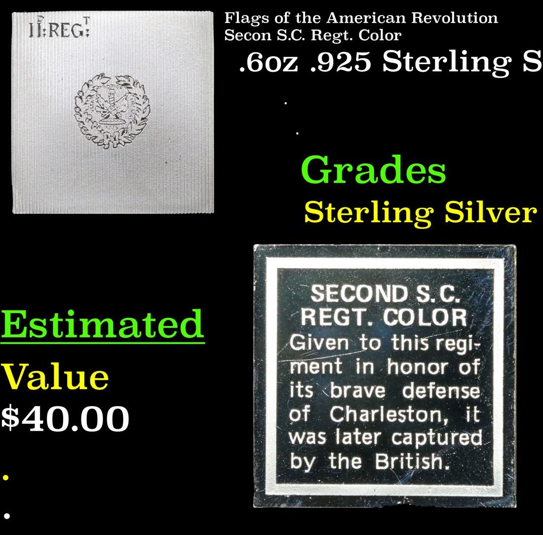 Flags of the American Revolution Secon S.C. Regt. Color . . .6oz .925 Sterling Silver Bar Grades. This vintage Franklin Mint set includes 64 pieces. We will be bringing the entire set to you throughout all of our Fall Extravaganza auction. This Set of 64 ingots represents different flags of American soldiers during the Revolutionary War . This ingot is "Second S.C. Regt Color" flag. It is 415 grains of Sterling Silver. Each piece is more beautiful than the next. A truly wonderful collection. This is a rare and highly sought after collectible.