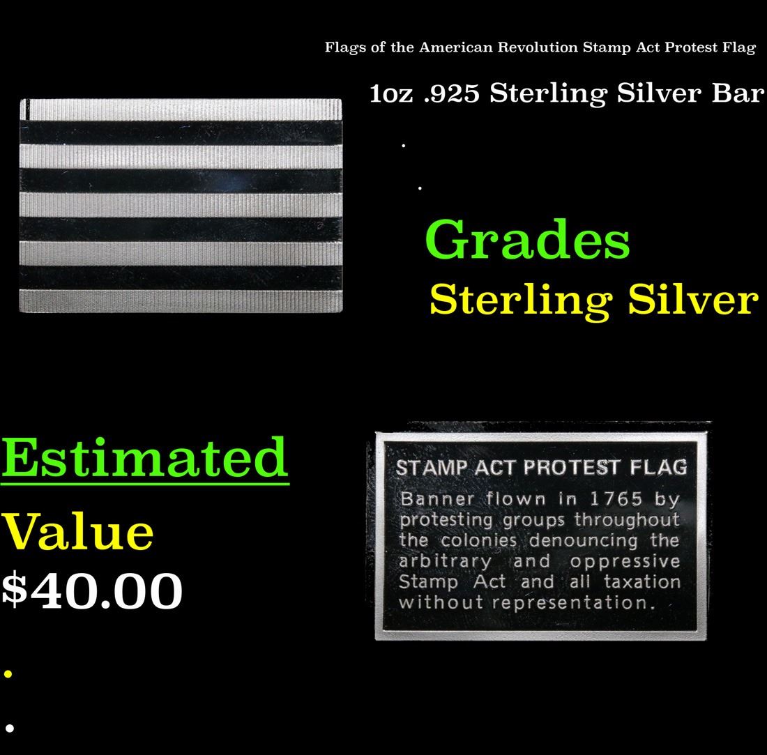 Flags of the American Revolution Stamp Act Protest Flag . . 1oz .925 Sterling Silver Bar Grades. This vintage Franklin Mint set includes 64 pieces. We will be bringing the entire set to you throughout all of our Fall Extravaganza auction. This Set of 64 ingots represents different flags of American soldiers during the Revolutionary War . This ingot is "Stamp Act Protest" flag. It is 415 grains of Sterling Silver. Each piece is more beautiful than the next. A truly wonderful collection. This is a rare and highly sought after collectible.