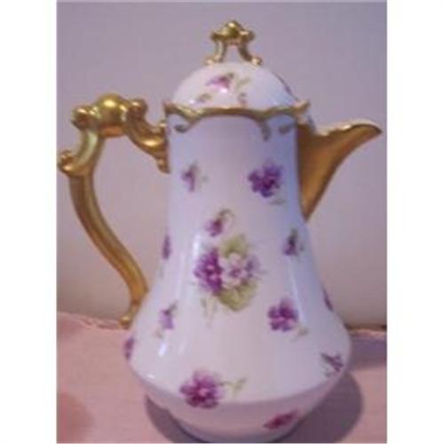 </font></strong>This gorgeous chocolate pot was decorated by Flambeau, a company that operated first as a decorator and then branched into manufacture of Limoges. The company was in operation from the 1890s until World War I, which dates this piece back to 1917 or earlier. I have not been able to determine whether the second mark ("France Limoges") indicates a different manufacturer, or whether it indicates that Flambeau manufactured this piece as well.<p>The chocolate pot stands ten (10) inches high, and is decorated with small clusters of handpainted violets with soft green accents and a heavy gold trim. It is in excellent undamaged condition. It is signed by the artist just underneath one of the violets clusters.</font>
