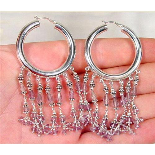 Our gemstone showcase consists of the finest NATURAL gemstones set by hand in elaborate sterling and these earrings are no exception.... Our handcrafted natural faceted amethyst gemstone chandeliers are of superb quality and unique designer style. Fashioned in exquisite sterling, will quickly become your favorite piece of jewelry. The hoop of the earring has a diameter of 40mm. Simply a finely executed design with impeccible brilliant natural faceted amethyst fashioned in elaborate sterling. A very impressive gram weight of 30. The earrings have a length of 3.2". Definitely heavy guage to last a lifetime. (a421)