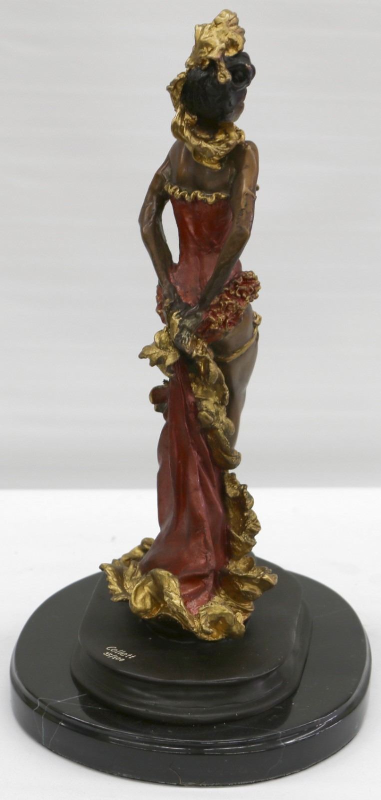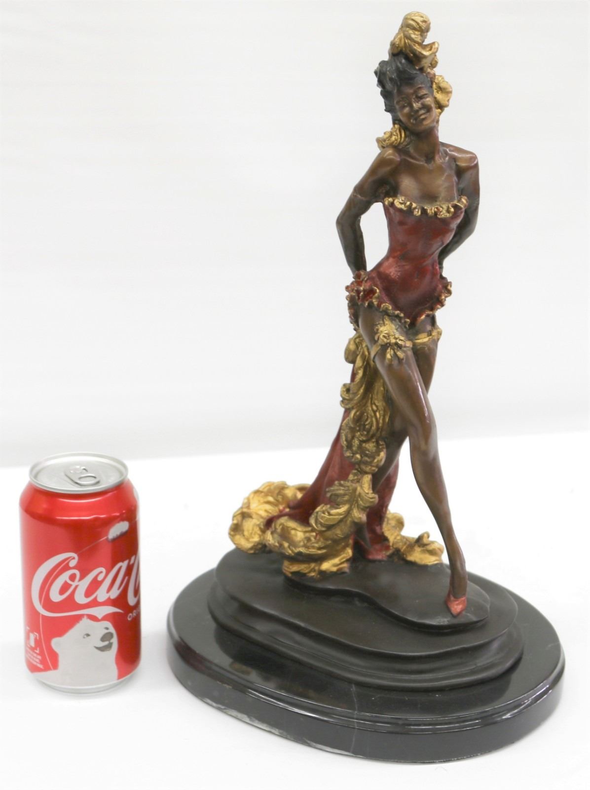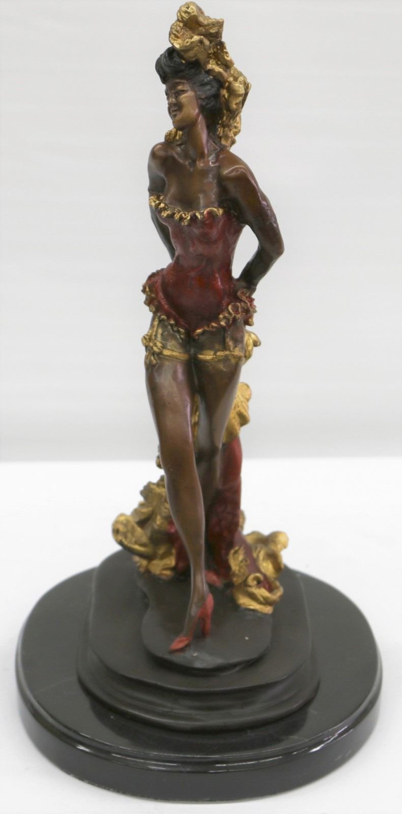 She flirtatiously cools herself off with her red-feathered fan as she cocks her head off to the side and bats her eyelashes. She walks one foot in front of the other allowing her long luscious legs to follow. She looks like she has come straight out of the Moulin Rouge wearing nothing but a corset with ruffles around the trimming and plenty of feathers. Being a burlesque dancer you can never have too many feathers. As she walks through the crowd she shakes her tail feathers proudly while she confidently turns heads. Her hair is pulled back into a loose bun letting some of her tassels hang loose and also sports a red feather in her hair. This bronze sculpture has amazing intricate details which you will keep discovering each time you look at her. This sculpture was cast using the Lost Wax Method ensuring quality and detail This sculpture is bronze and it has a brown patina and mounted on a marble base. Dimensions: Height 17 X Width 9 inches. Weight: 13 LBS.