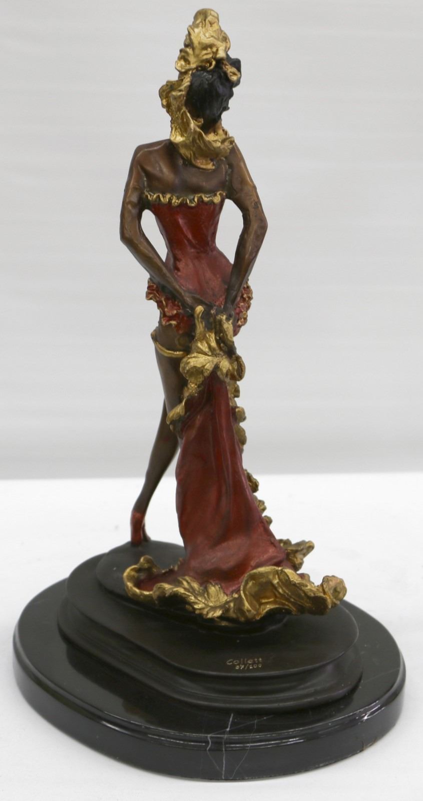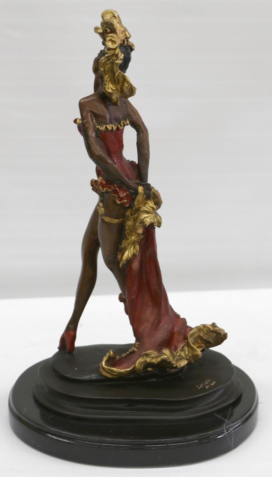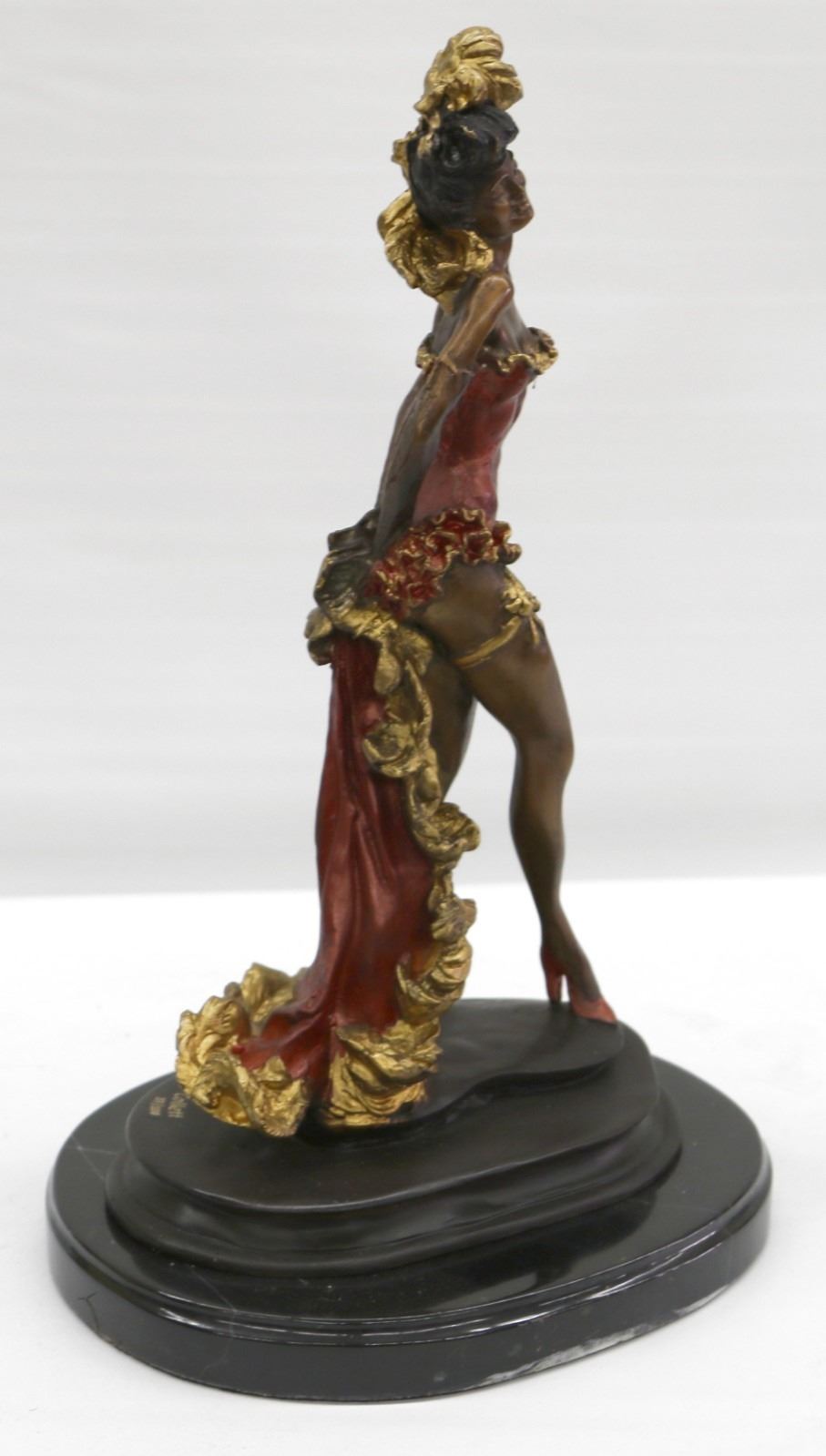 She flirtatiously cools herself off with her red-feathered fan as she cocks her head off to the side and bats her eyelashes. She walks one foot in front of the other allowing her long luscious legs to follow. She looks like she has come straight out of the Moulin Rouge wearing nothing but a corset with ruffles around the trimming and plenty of feathers. Being a burlesque dancer you can never have too many feathers. As she walks through the crowd she shakes her tail feathers proudly while she confidently turns heads. Her hair is pulled back into a loose bun letting some of her tassels hang loose and also sports a red feather in her hair. This bronze sculpture has amazing intricate details which you will keep discovering each time you look at her. This sculpture was cast using the Lost Wax Method ensuring quality and detail This sculpture is bronze and it has a brown patina and mounted on a marble base. Dimensions: Height 17 X Width 9 inches. Weight: 13 LBS.
