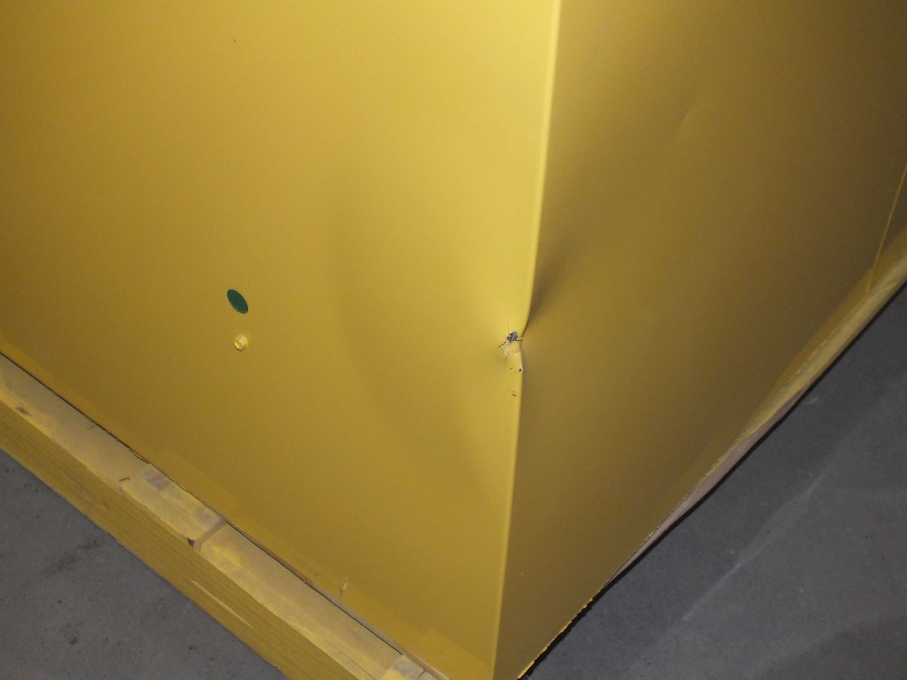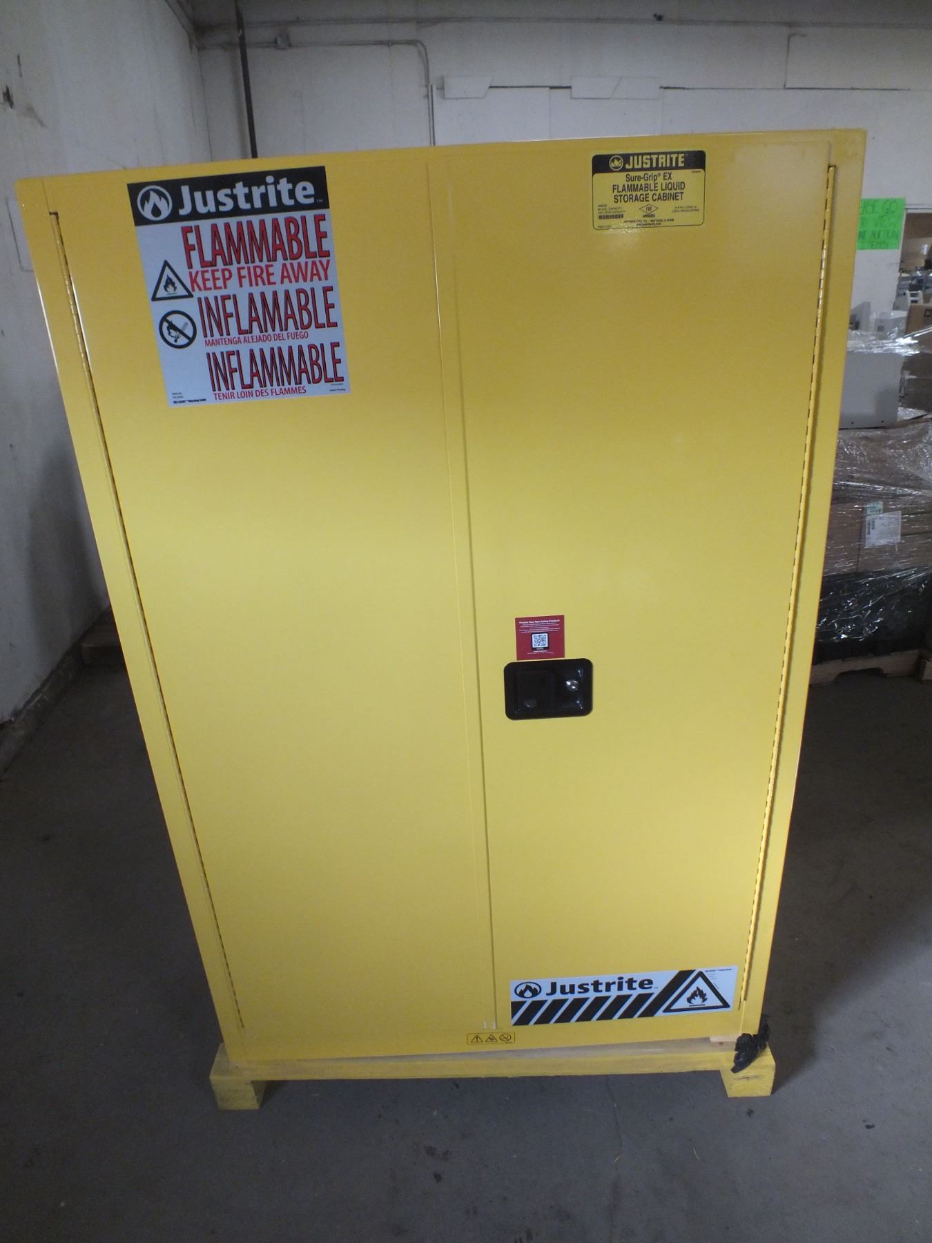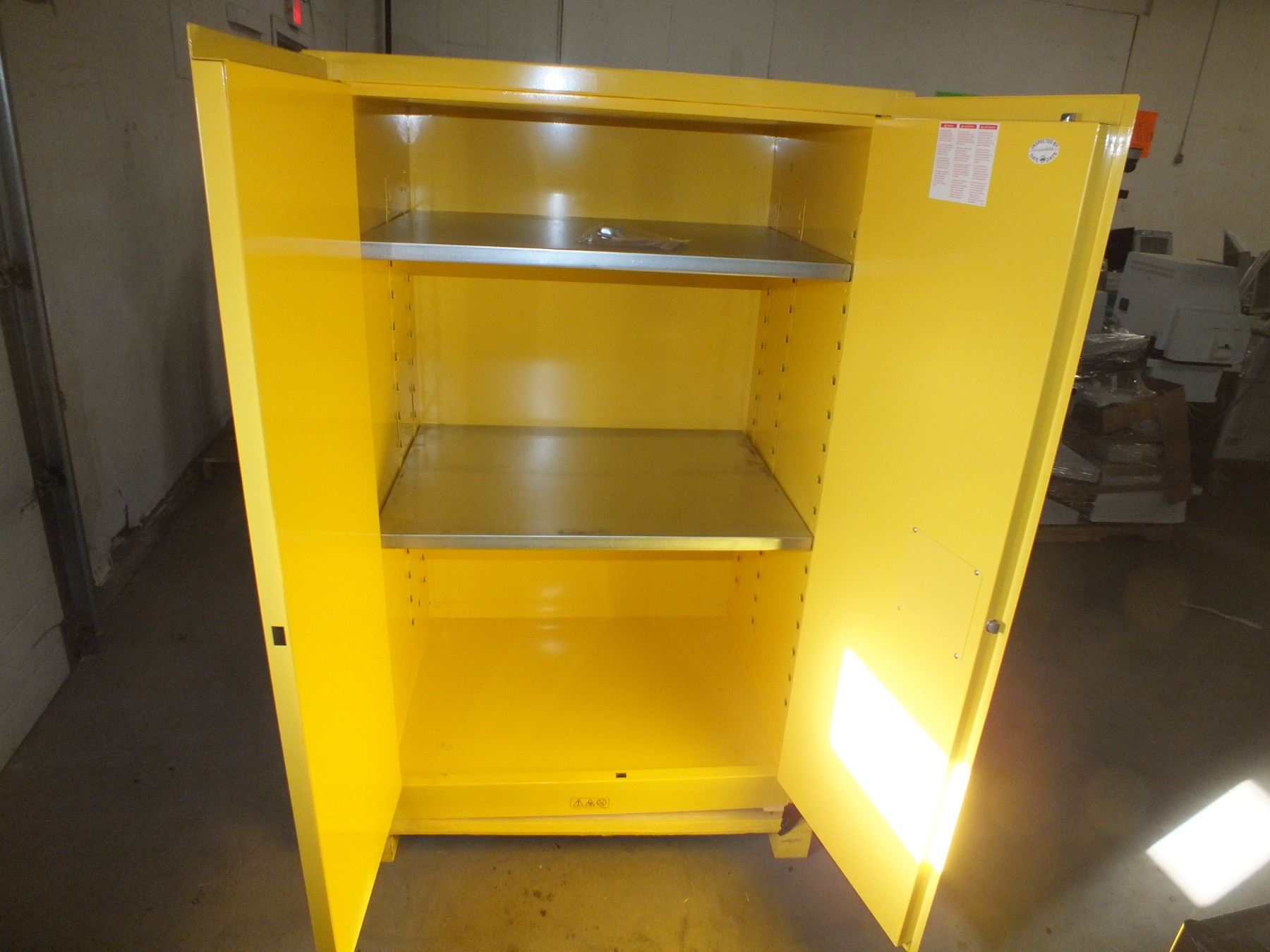 Flammable Liquid Storage Cabinet w/ Keys, 43"w 34"d 69"h, some damage as seen in the photos, like new condition...freight claim...sold as is / where is