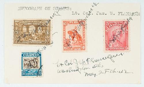 A group of four postage stamps signed by Lieut. Colonel James Wainwright Flanagan. Flanagan was advisor to President Roosevelt, gold miner and member of the Cuban Army.