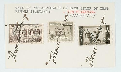 A group of three postage stamps from Ireland, Ecuador and Rumania all of which are signed by Tom Flanagan, the famed marathon runner.