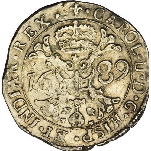 <B>Flanders. Charles II Patagon 1689, </B></I>KM63, Delm-344, Davenport 4494, choice lustrous XF+, crudely made but very attractive.<BR><BR><b>Shipping:</b> Coin/Currency (<a target="_blank" href="http://www.heritageauctions.com/common/shipping.php">view shipping information</a>)