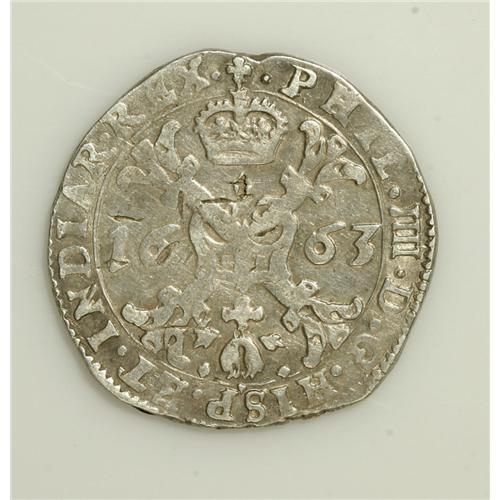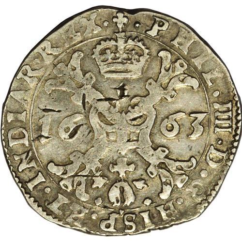 <B>Flanders. Philip IV 1/2 Patagon 1663, </B></I>KM33, date unlisted in KM and Delmonte, nice VF+, crudely struck but with very clear details including the date. Presumably very rare.<BR><BR><b>Shipping:</b> Coin/Currency (<a target="_blank" href="http://www.heritageauctions.com/common/shipping.php">view shipping information</a>)