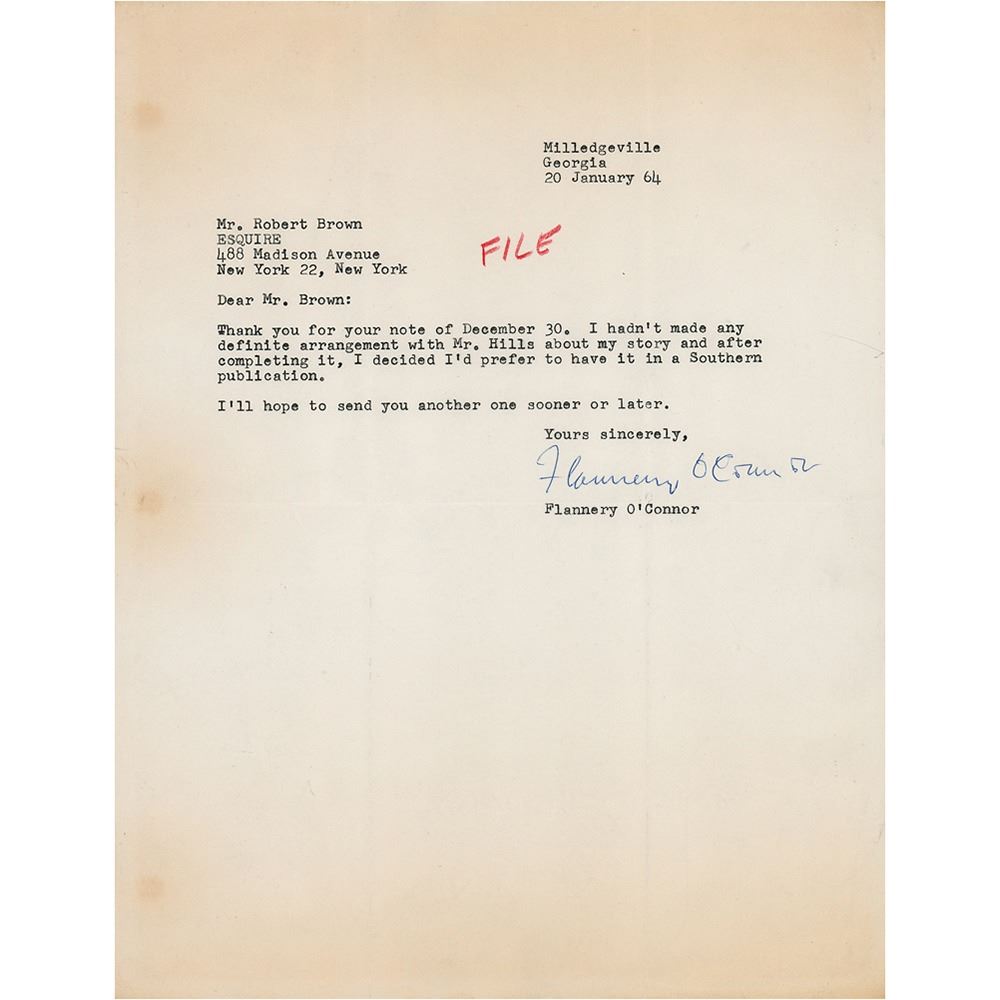 TLS, one page, 8.5 x 11, January 20, 1964. Letter to Esquire fiction editor Robert Brown, in full: "Thank you for your note of December 30. I hadn't made any definite arrangement with Mr. Gills about my story and after completing it, I decided I'd prefer to have it in a Southern publication. I'll hope to send you another one sooner or later." In fine condition, with some light creasing and faint toning.