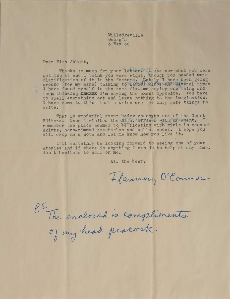 Rare TLS, one page, 8.5 x 11, May 3, 1956. Letter to Miss Abbott, in full: "Thanks so much for your letter. I see now what you were getting at and I think you were right, though you needed more clarification of it in the feature. Lately I have been going around (for my sins) talking to ladies clubs and several times I have found myself in the same fix—me saying one thing and them thinking I'm saying the exact opposite. You have to spell everything out and leave nothing to the imagination. I have come to think that stories are the only safe things to write. That is wonderful about being chosen as one of the Guest Editors. Once I visited the Mlle. offices with my agent. I remember the place seemed to be floating with girls in peasant skirts, horn-rimmed spectacles and ballet shoes. I hope you will drop me a note and let me know how you like it. I'll certainly be looking forward to seeing one of your stories and if there is anything I can do at any time, don't hesitate to call on me." O'Connor adds a postscript in her own hand, "The enclosed is compliments of my head peacock." Included is a four-page pamphlet entitled "Peafowl and Their Care," dated November, 1931. In fine condition, with light offsetting of the handwriting from premature folding. A scarce, exceptional letter boasting outstanding literary content.