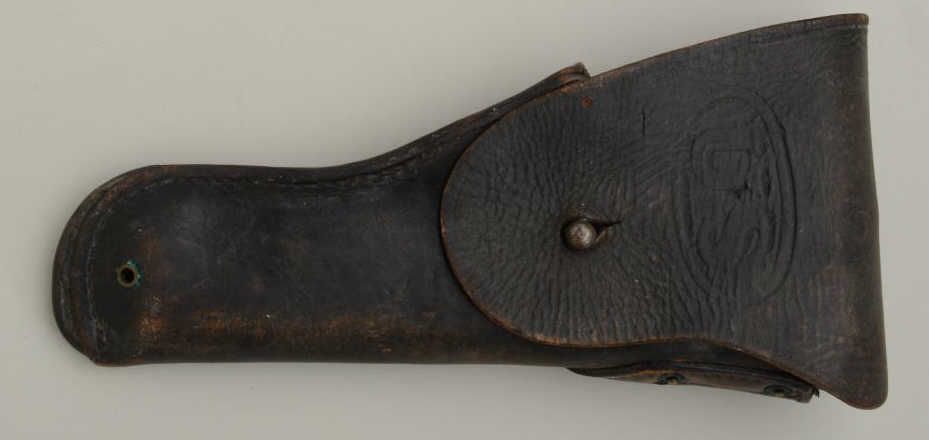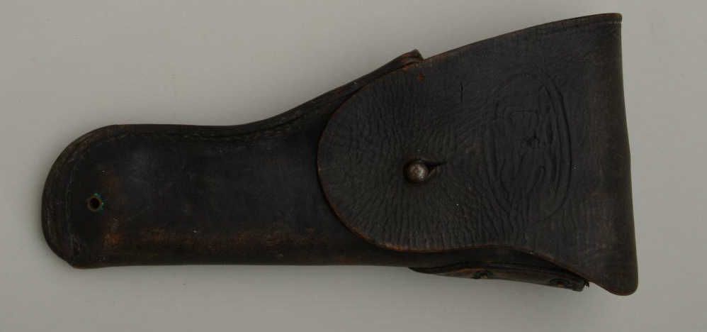 Flap holster for .45 Colt auto with large embossed US and marked on back great and Grafton and Knight company 1943. The front of the holster has been dyed black. The inside of the holster is penned in ink Ragan and A F LT. The condition is fair. Est.: $30-$60
