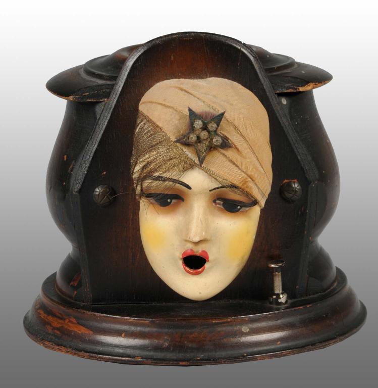 Description American. 1920s. Wood with composition and cloth depiction of “flapper” with open mouth. Pushing lever dispenses cigarette through the flapper’s mouth. Works well. Condition (Excellent). Size 6 - 1/2" T.