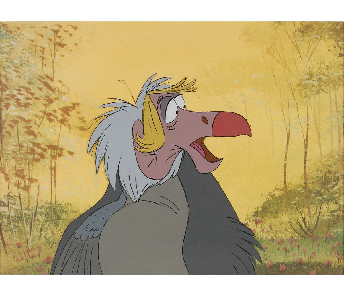 (Walt Disney Studios, 1967) Original production cel featuring Flaps the Vulture from The Jungle Book, The cel is placed on a studio copy background. Image measures 7 x 6.75, with a mat opening of 11.25 x 8.5, and is double-matted to an overall size of 16 x 12. In fine condition. Flaps and the other vultures from the film were loosely modeled after the Beatles, complete with English accents and shag haircuts.