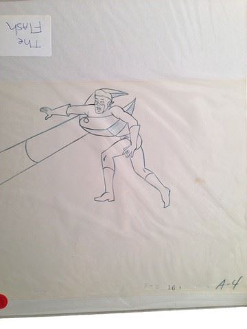 "Flash" Animation Cel (featuring "Kid Flash" battling an evil scientist / includes original hand drawn character sketch / 1967 / Filmation Studios / 12" x 9")