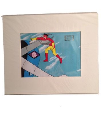 "Flash" Animation Cel (featuring "Kid Flash" battling an evil scientist / includes original hand drawn character sketch / 1967 / Filmation Studios / 12" x 9")