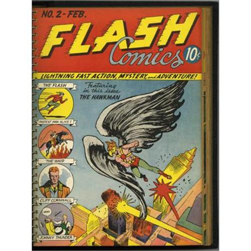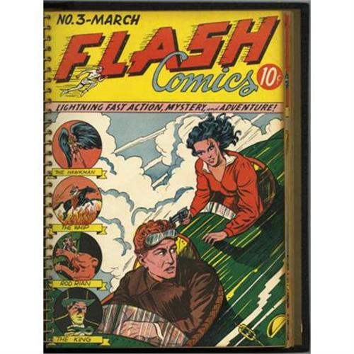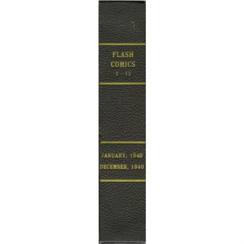<B>Flash Comics #1-12 Bound Volume (DC, 1940).</B></I> Yes, one of the ten most valuable comics in the hobby is included in this amazing bound volume. Since this spiral-bound hardcover came from the Gaines family, it's obviously an office copy from M. C. Gaines' All-American Comics, the publisher of this series. Inside are such highlights as the first appearances of the Flash, Hawkman, and Johnny Thunder, and lots of amazing Sheldon Moldoff covers. The covers are in the superb condition we've come to expect from bound volumes -- you would need a run of VF-and-up copies to enjoy covers this nice, and that would be so expensive it's not even worth discussing. All of the pages have brittle edges, the pages are tan for the most part. The first page of issue #1 is detached. Overstreet 2007 VG 4.0 value for group = $22,292.<BR><BR><b>Shipping:</b> Books & Catalogs (<a target="_blank" href="http://www.heritageauctions.com/common/shipping.php">view shipping information</a>)
