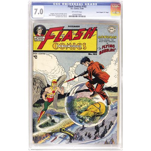 <B>Flash Comics #102 Davis Crippen ("D" Copy) pedigree (DC, 1948) CGC FN/VF 7.0 Off-white pages.</B></I> This title's great run was nearing the end by the time this issue came out -- low print runs were the result, and in fact, this issue is termed "scarce" by Overstreet. Note Hawkman's unfamiliar (and short-lived) costume on Joe Kubert's cover! The comic certainly wasn't lacking for quality heroes or creators: Hawkman (by Kubert), Flash (by Alex Toth), the Atom, and Black Canary (by Carmine Infantino) appear. Overstreet 2006 FN 6.0 value = $768; VF 8.0 value = $1,600. CGC census 7/06: 1 in 7.0, 2 higher. <I>From the Crippen Collection.</B></I> <BR><BR><B>Important notice:</B> Heritage usually auctions material at the rate of 200-250 lots per hour. On some occasions eBay Live bid software or the Internet may not be able to keep up with the pace of the auction. We recommend placing a realistic absentee bid now as insurance to avoid disappointment. Occasionally the auctioneer may eliminate or reject an eBay Live bid, and the auctioneer may also reopen a lot after the close of the eBay live bidding (usually because we missed an audience bid), and may reject your bid even if it shows you as the winning bidder. By bidding via eBay Live, you agree that Heritage may award the lot to another bidder at its sole discretion under the circumstances described above or any other reasonable circumstances. Since eBay bids are not shown to us until we open the lot on the floor, we treat those bids just like floor bids. In most cases the floor responds before the eBay bid is presented to us, due to Internet lag time, so for consistency we have made it a policy that floor bids are always considered first over tie eBay live bids. Also please note that all Heritage lots purchased through eBay Live carry a 22.5% Buyer's Premium. Please make sure you read the Terms and Conditions before you bid. This lot is being auctioned in conjunction with a live floor auction by Heritage Auction Galleries. All final auction and invoice information will be supplied by Heritage Auction Galleries, and all other information should be considered preliminary. Lot:41001 <BR><BR><B>Winning Notification and Billing:</B> After the FINAL session in this auction is complete, Heritage will send e-mail and snail mail invoices. This process normally takes several days. All final auction and invoice information will be supplied by Heritage Auction Galleries, and all other information should be considered preliminary. <BR><BR>This auction will be conducted on a live auction floor and over the Internet through eBay Live. If you choose to place an absentee bid, please take a moment to <font color='#0000ff'><u><a href='http://pages.ebay.com/liveauctions/help/before/laabsentee.html'>learn how eBay Live absentee bidding works</a></u></font><font color='#000000'>