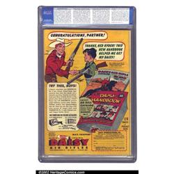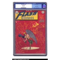 Flash Comics #104 (DC, 1949) CGC VF 8.0 Off-white pages. Joe Kubert's classy cover highlights this issue, which, as the final issue of a historic run, gave a clear sign that the Golden Age was drawing to an end. Curiously, the origin of the Flash was retold in this issue. Of course, the World's Fastest Human would return after a seven-year hiatus in Showcase #4 and kick off the Silver Age of Comics. The highest grade CGC has assigned a copy of this issue to date is Very Fine Plus, and only one such copy has graded higher than this rarity from 1949. Overstreet gives the book a "scarce" rating. Overstreet 2002 VF 8.0 value = $4,100. Important notice: We expect to be auctioning lots at the rate of 200-250 per hour. Sometimes eBay Premier live bid software cannot keep up with that pace, so we strongly recommend that you place a realistic proxy bid now as insurance to avoid disappointment. Also please note that all Heritage/CAA lots purchased through eBay Premier carry a 20% Buyer's Premium. Please make sure you read the Terms and Conditions.