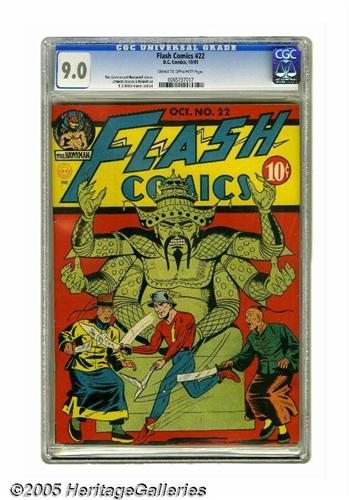 <B>Flash Comics #22 (DC, 1941) CGC VF/NM 9.0 Cream to off-white pages.</B></I> A scowling six-armed idol looks menacing as two sword-wielding Chinese men threaten the Fastest Man Alive on this great Golden Age cover. Inside, there's art by E. E. Hibbard and Shelly Moldoff to thrill you. This is a terrific copy: outside of a minor rounded corner, this one looks fresh and new. Overstreet 2005 VF/NM 9.0 value = $1,778; NM- 9.2 value = $2,400. CGC census 7/05: 3 in 9.0, 1 higher.