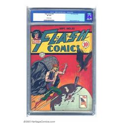 Flash Comics #33 (DC, 1942) CGC VF 8.0 Off-white pages. Hawkman gets a hand bombing the Japanese from one of his hawk friends on this classic cover by Sheldon Moldoff. This issue is also a minor key, as it is the origin of Shade. High-grade copies of major Golden Age titles will always be in high demand. This beautiful copy has no major flaws to detract from its overall appeal. Overstreet 2002 VF 8.0 value = $713. Important notice: We expect to be auctioning lots at the rate of 200-250 per hour. Sometimes eBay Premier live bid software cannot keep up with that pace, so we strongly recommend that you place a realistic proxy bid now as insurance to avoid disappointment. Also please note that all Heritage/CAA lots purchased through eBay Premier carry a 20% Buyer's Premium. Please make sure you read the Terms and Conditions.