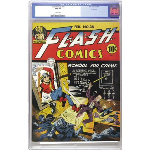 <B>Flash Comics #38 Vancouver pedigree (DC, 1943) CGC NM 9.4 White pages.</B></I> The page quality and overall eye-appeal of this NM pedigree book make it look as if someone had just paid a dime for it back before World War II. Art by Sheldon Moldoff and E. E. Hibbard adds to the appeal. Overstreet 2006 NM- 9.2 value = $1,500. CGC census 10/06: 1 in 9.4, 1 higher.<BR><BR><b>Shipping:</b> Slabbed Comic (<a target="_blank" href="http://www.heritageauctions.com/common/shipping.php">view shipping information</a>)