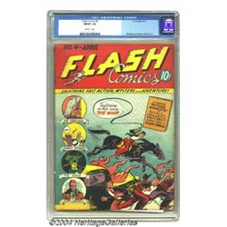 Flash Comics #4 (DC, 1940) CGC FN/VF 7.0 Off-white pages. The Whip gets his very first, and last, cover on this fourth issue. Gerber states that the cover art is by Sheldon Moldoff, but we believe this is the work of Ed Wheelan, whose own feature, "Minute Movies," is also featured in this issue. By the time of Flash Comics #6, all the covers would alternate between the Flash and Hawkman, making this an unusual item. To date, this handsome copy is bested by only two others in CGC's census for issue #4. Overstreet 2003 FN 6.0 value = $1,260; VF 8.0 value = $2,625. Important notice: Heritage usually auctions material at the rate of 200-250 lots per hour. On some occasions eBay Live bid software or the Internet may not be able to keep up with the pace of the auction. We recommend placing a realistic absentee bid now as insurance to avoid disappointment. Occasionally the auctioneer may eliminate or reject an eBay Live bid, and the auctioneer may also reopen a lot after the close of the eBay live bidding (usually because we missed an audience bid), and may reject your bid even if it shows you as the winning bidder. By bidding via eBay Live, you agree that Heritage may award the lot to another bidder at its sole discretion under the circumstances described above or any other reasonable circumstances. Since eBay bids are not shown to us until we open the lot on the floor, we treat those bids just like floor bids. In most cases the floor responds before the eBay bid is presented to us, due to Internet lag time, so for consistency we have made it a policy that floor bids are always considered first over tie eBay live bids. Also please note that all Heritage lots purchased through eBay Live carry a 20% Buyer's Premium. Please make sure you read the Terms and Conditions before you bid.