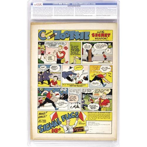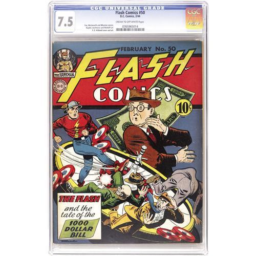 <B>Flash Comics #50 (DC, 1944) CGC VF- 7.5 Cream to off-white pages.</B></I> The Flash is joined in this issue by Hawkman, Johnny Thunder, the Whip, and the Ghost Patrol. As for the E. E. Hibbard cover, the "1,000 Dollar Bill" depicted isn't far off from what it will likely take to secure this nice copy at auction! Overstreet 2006 VF 8.0 value = $600. CGC census 6/06: 1 in 7.5, 2 higher. <BR><BR><B>Important notice:</B> Heritage usually auctions material at the rate of 200-250 lots per hour. On some occasions eBay Live bid software or the Internet may not be able to keep up with the pace of the auction. We recommend placing a realistic absentee bid now as insurance to avoid disappointment. Occasionally the auctioneer may eliminate or reject an eBay Live bid, and the auctioneer may also reopen a lot after the close of the eBay live bidding (usually because we missed an audience bid), and may reject your bid even if it shows you as the winning bidder. By bidding via eBay Live, you agree that Heritage may award the lot to another bidder at its sole discretion under the circumstances described above or any other reasonable circumstances. Since eBay bids are not shown to us until we open the lot on the floor, we treat those bids just like floor bids. In most cases the floor responds before the eBay bid is presented to us, due to Internet lag time, so for consistency we have made it a policy that floor bids are always considered first over tie eBay live bids. Also please note that all Heritage lots purchased through eBay Live carry a 22.5% Buyer's Premium. Please make sure you read the Terms and Conditions before you bid. This lot is being auctioned in conjunction with a live floor auction by Heritage Auction Galleries. All final auction and invoice information will be supplied by Heritage Auction Galleries, and all other information should be considered preliminary. Lot:41001 <BR><BR><B>Winning Notification and Billing:</B> After the FINAL session in this auction is complete, Heritage will send e-mail and snail mail invoices. This process normally takes several days. All final auction and invoice information will be supplied by Heritage Auction Galleries, and all other information should be considered preliminary. <BR><BR>This auction will be conducted on a live auction floor and over the Internet through eBay Live. If you choose to place an absentee bid, please take a moment to <font color='#0000ff'><u><a href='http://pages.ebay.com/liveauctions/help/before/laabsentee.html'>learn how eBay Live absentee bidding works</a></u></font><font color='#000000'>