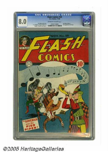 <B>Flash Comics #59 (DC, 1944) CGC VF 8.0 Off-white to white pages.</B></I> We've heard of taking notes, but how about taking notes and bludgeoning bad guys with 'em? That's Hawkman's technique on this creative Sheldon Moldoff cover. The fellow playing the tune is the Pied Piper, who makes his first appearance in this issue (not the same Pied Piper whom the Flash battled in the Silver Age). The Hawkman story also has Moldoff art. Other features include the Flash and Johnny Thunder, as well as the feature Minute Movies, which had been around since issue #1 but had its last "showing" here. Overstreet 2005 VF 8.0 value = $544. CGC census 2/05: 1 in 8.0, 2 higher.