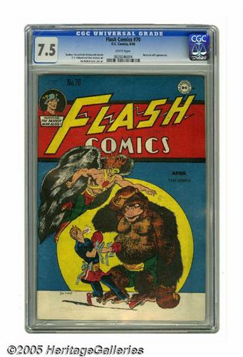 <B>Flash Comics #70 (DC, 1946) CGC VF- 7.5 White pages.</B></I> This Hawkman cover features a boxing gorilla, drawn by Joe Kubert. E. E. Hibbard and Stan Josephs contribute interior art. Mutt and Jeff appearance. A very attractive copy, with great page quality. Overstreet 2005 VF 8.0 value = $481. CGC census 6/05: 1 in 7.5, 4 higher.
