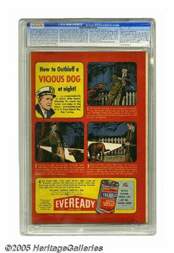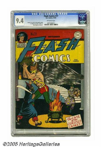 <B>Flash Comics #77 (DC, 1946) CGC NM 9.4 Off-white pages.</B></I> Here's the only copy graded above 9.0 by CGC as of this writing. Chet Kozlak drew Hawkman on the cover as well as inside the book. Also appearing in these pages are the Flash (of course), the Ghost Patrol, and Johnny Thunder. Overstreet 2005 NM- 9.2 value = $1,000. CGC census 6/05: 1 in 9.4, none higher.