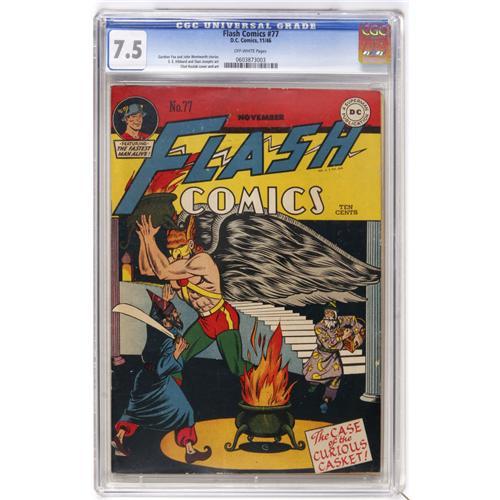 <B>Flash Comics #77 (DC, 1946) CGC VF- 7.5 Off-white pages.</B></I> E.E. Hibbard art. Overstreet 2006 VF 8.0 value = $488. CGC census 3/07: 1 in 7.5, 2 higher.<BR><BR><b>Shipping:</b> Comics - Slabbed (certified) (<a target="_blank" href="http://www.heritageauctions.com/common/shipping.php">view shipping information</a>)