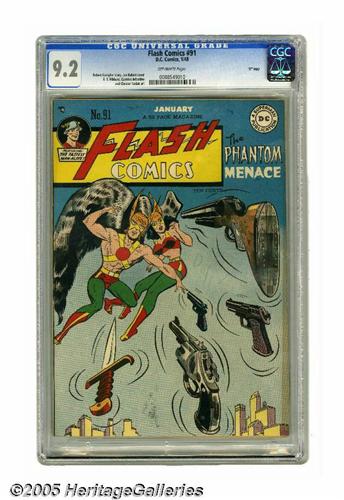 <B>Flash Comics #91 "D" Copy pedigree (DC, 1948) CGC NM- 9.2 Off-white pages.</B></I> Who ever heard of a title like "The Phantom Menace" anyway? This issue has a Joe Kubert cover; in addition to the Hawkman and Flash tales, there's a Johnny Thunder story drawn by Carmine Infantino in which Johnny gets help from more than just his Thunderbolt, as Black Canary makes an early appearance. Our offering is the only copy to be graded above 8.0 by CGC to date. Overstreet 2005 NM- 9.2 value = $1,700. CGC census 7/05: 1 in 9.2, none higher.