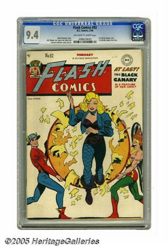 <B>Flash Comics #92 (DC, 1948) CGC NM 9.4 Off-white to white pages.</B></I> Overstreet notes that this key issue is "rare in Mint due to black ink smearing on white cover." Well, there's no sign of any smearing on this outstanding copy. This issue is Black Canary's first cover appearance as well as her first solo story (i.e. her first story without Johnny Thunder). Plus, it's got the first appearance of detective Larry Lance, who became a recurring character in Black Canary's adventures. It is also the first time we readers saw the black canary-shaped locket she wore around her neck, which had handy devices hidden inside. Carmine Infantino (in the phase when his art was heavily influenced by Milton Caniff) drew the character on the cover and inside the issue. This star-studded affair also features Flash (drawn by Lee Elias), Hawkman (drawn by Joe Kubert), and the Atom. Overstreet 2005 NM- 9.2 value = $5,000. CGC census 7/05: 2 in 9.4, none higher.