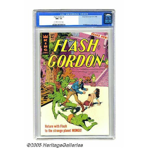 <B>Flash Gordon #1 (King Features Syndicate, 1966) CGC NM+ 9.6 Off-white to white pages.</B></I> First Silver Age appearance of Flash Gordon. Al Williamson cover and art. Overstreet 2005 NM- 9.2 value = $90. CGC census 8/05: 3 in 9.6, 2 higher. <BR><BR><B>Important notice:</B> Heritage usually auctions material at the rate of 200-250 lots per hour. On some occasions eBay Live bid software or the Internet may not be able to keep up with the pace of the auction. We recommend placing a realistic absentee bid now as insurance to avoid disappointment. Occasionally the auctioneer may eliminate or reject an eBay Live bid, and the auctioneer may also reopen a lot after the close of the eBay live bidding (usually because we missed an audience bid), and may reject your bid even if it shows you as the winning bidder. By bidding via eBay Live, you agree that Heritage may award the lot to another bidder at its sole discretion under the circumstances described above or any other reasonable circumstances. Since eBay bids are not shown to us until we open the lot on the floor, we treat those bids just like floor bids. In most cases the floor responds before the eBay bid is presented to us, due to Internet lag time, so for consistency we have made it a policy that floor bids are always considered first over tie eBay live bids. Also please note that all Heritage lots purchased through eBay Live carry a 20% Buyer's Premium. Please make sure you read the Terms and Conditions before you bid. This lot is being auctioned in conjunction with a live floor auction by Heritage Galleries & Auctioneers. All final auction and invoice information will be supplied by Heritage Galleries & Auctioneers, and all other information should be considered preliminary. Lot:1404 <BR><BR><B>Winning Notification and Billing:</B> After the FINAL session in this auction is complete, Heritage will send e-mail and snail mail invoices. This process normally takes several days. All final auction and invoice informat