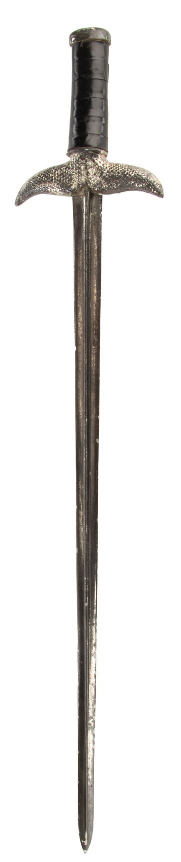 313. Flash Gordon "Hawkman" palace guard sword. (Universal, 1980) Vintage original sword prop constructed of cast resin metallized silver blade, grip and pommel, resin hilt, with leather strips affixed to grip, and expertly studio painted to appear as forged distressed metal. Measures 39 x 7 in. Exhibiting age, production wear and handling, with some chipping to paint on blade and resin hilt. In vintage good condition. $300 - $500