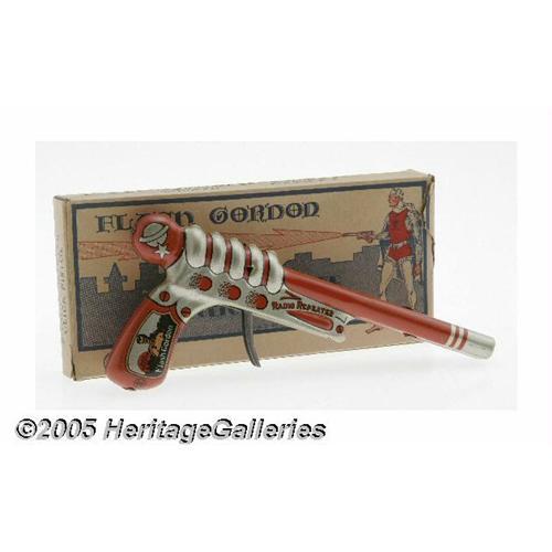 <B>Flash Gordon Radio Repeater Click Pistol with Original Box (Louis Marx, 1935).</B></I> While it might seem otherwise, the ray gun market of the 1930s wasn't comprised of only Buck Rogers merchandise. Louis Marx Co. created the Flash Gordon Radio Repeater. A simpler pressing than the Buck guns, the toy made up for it with colorful lithography. The original box has a tear at the right side, but the colors are sharp, and it is in Very Good condition overall. The gun measures 10"" long, and, aside from some light paint loss on the handle, is in Excellent condition. <BR><BR><B>Important notice:</B> Heritage usually auctions material at the rate of 200-250 lots per hour. On some occasions eBay Live bid software or the Internet may not be able to keep up with the pace of the auction. We recommend placing a realistic absentee bid now as insurance to avoid disappointment. Occasionally the auctioneer may eliminate or reject an eBay Live bid, and the auctioneer may also reopen a lot after the close of the eBay live bidding (usually because we missed an audience bid), and may reject your bid even if it shows you as the winning bidder. By bidding via eBay Live, you agree that Heritage may award the lot to another bidder at its sole discretion under the circumstances described above or any other reasonable circumstances. Since eBay bids are not shown to us until we open the lot on the floor, we treat those bids just like floor bids. In most cases the floor responds before the eBay bid is presented to us, due to Internet lag time, so for consistency we have made it a policy that floor bids are always considered first over tie eBay live bids. Also please note that all Heritage lots purchased through eBay Live carry a 20% Buyer's Premium. Please make sure you read the Terms and Conditions before you bid. This lot is being auctioned in conjunction with a live floor auction by Heritage Galleries & Auctioneers. All final auction and invoice information will be supplied by Heritage G