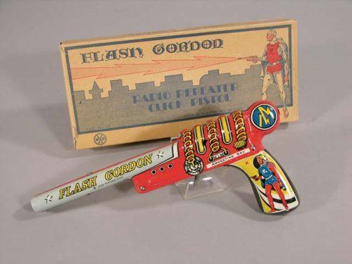 Flash Gordon Radio Repeater, click pistol, King Features syndication - Louis Marx 1935, 10" long, toy and box like new.
