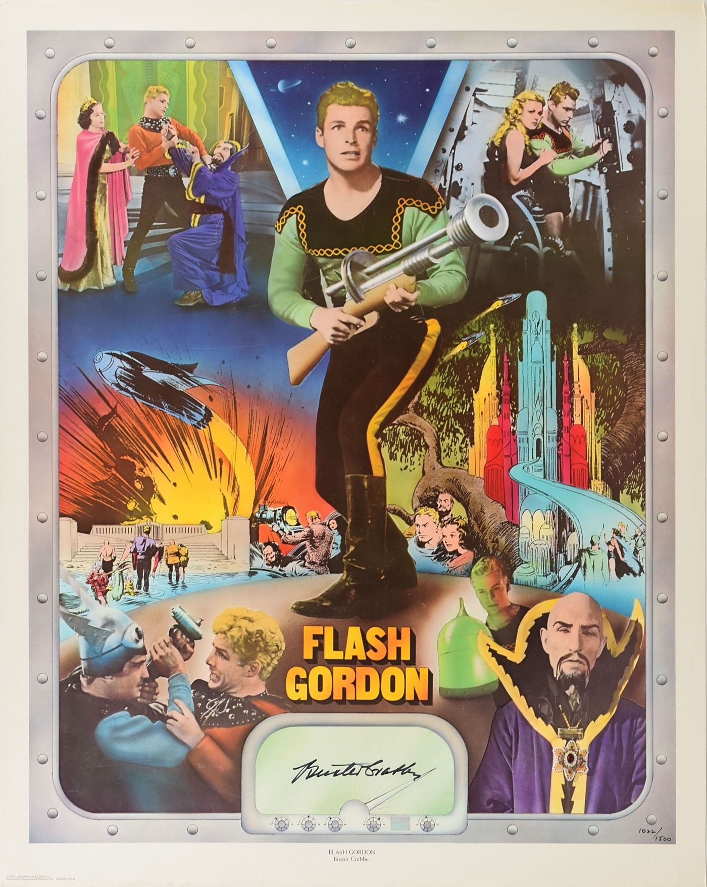 Limited edition color 24 x 30 print entitled 'Flash Gordon, Buster Crabbe,' depicting numerous scenes from the science fiction show, numbered 1022/1500, signed in black felt tip by Crabbe. Rolled and in fine condition, with scattered light creases and wrinkles.