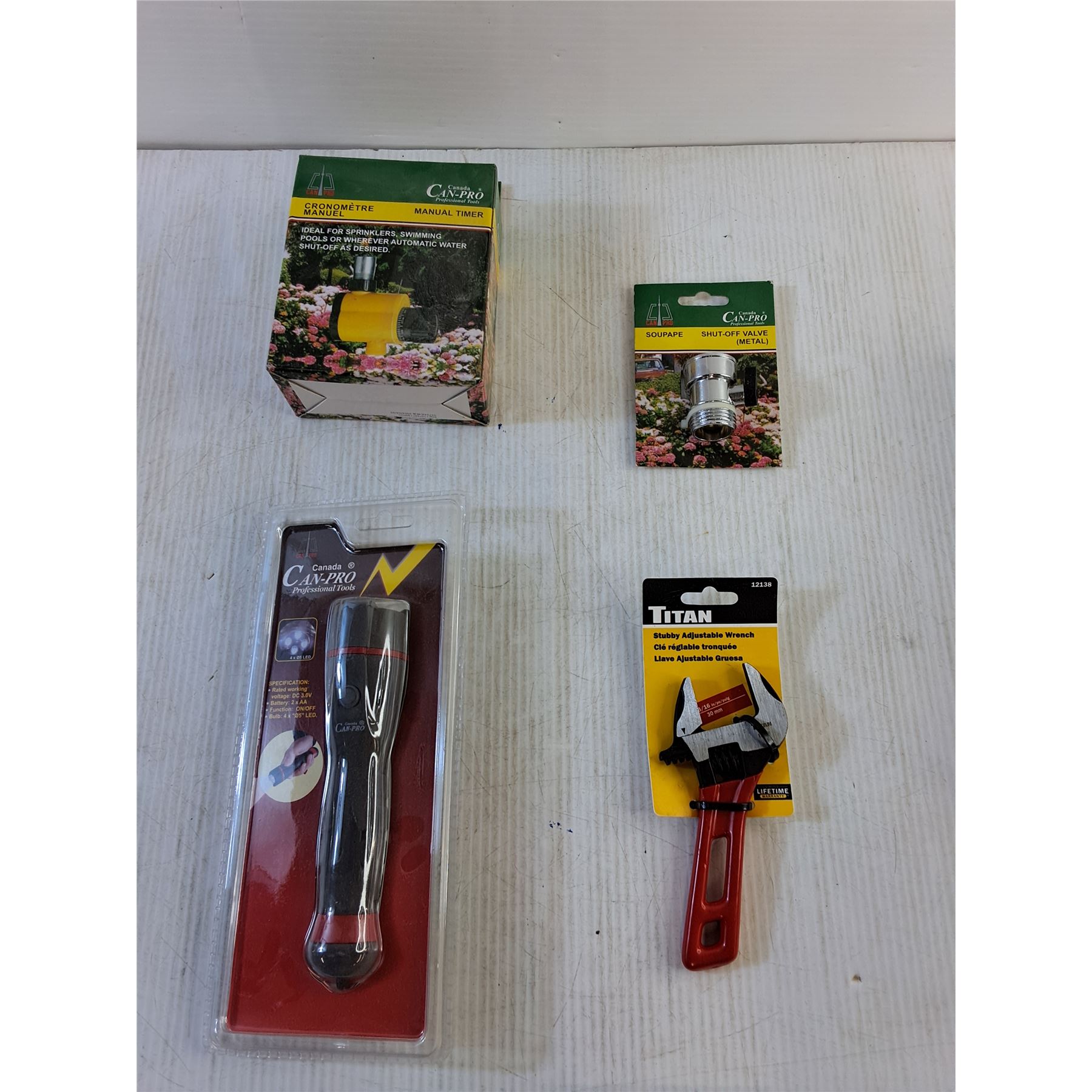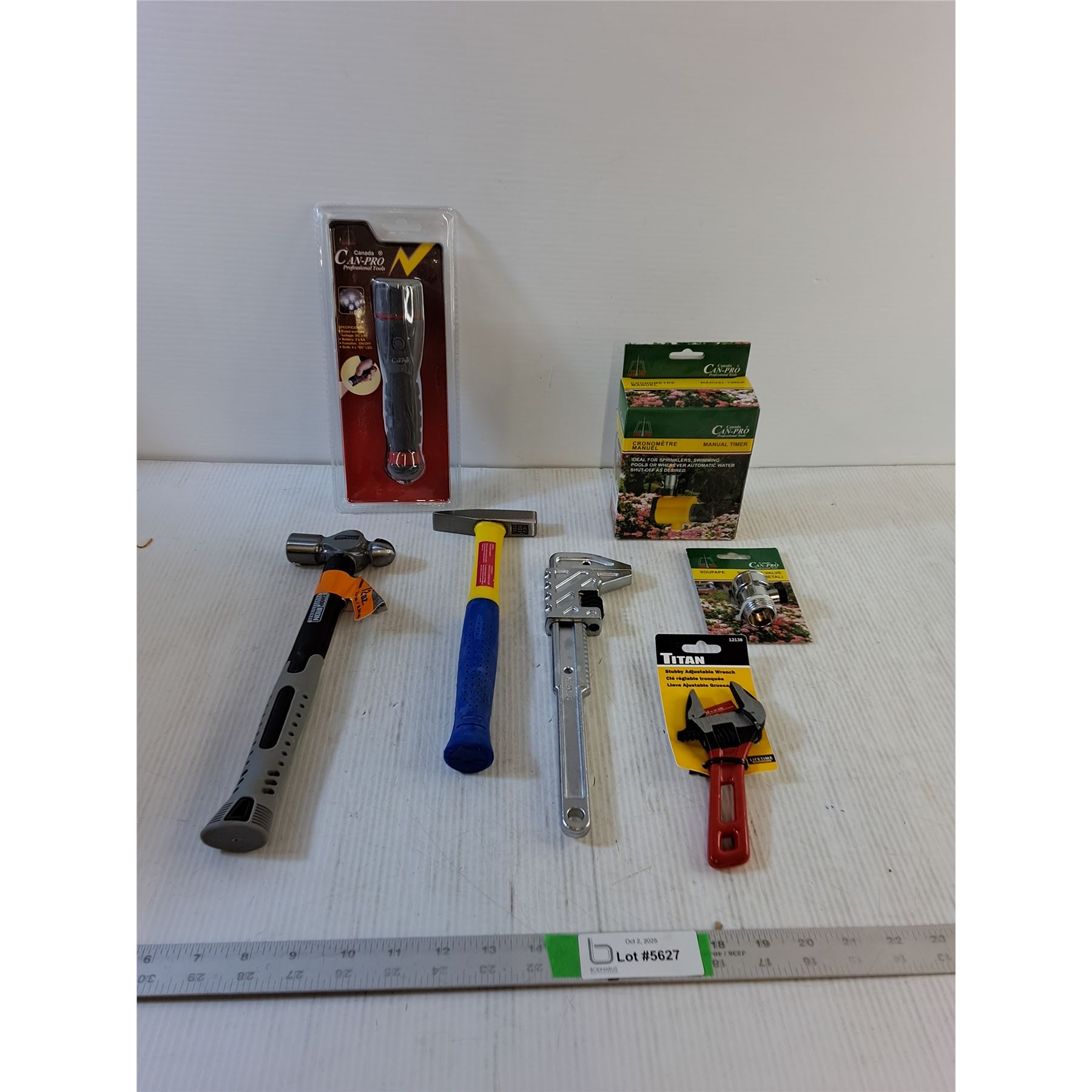 Flashlight, (2) Hammer, Wrench, Adjustable Wrench, Manual Timer & shut off Valve