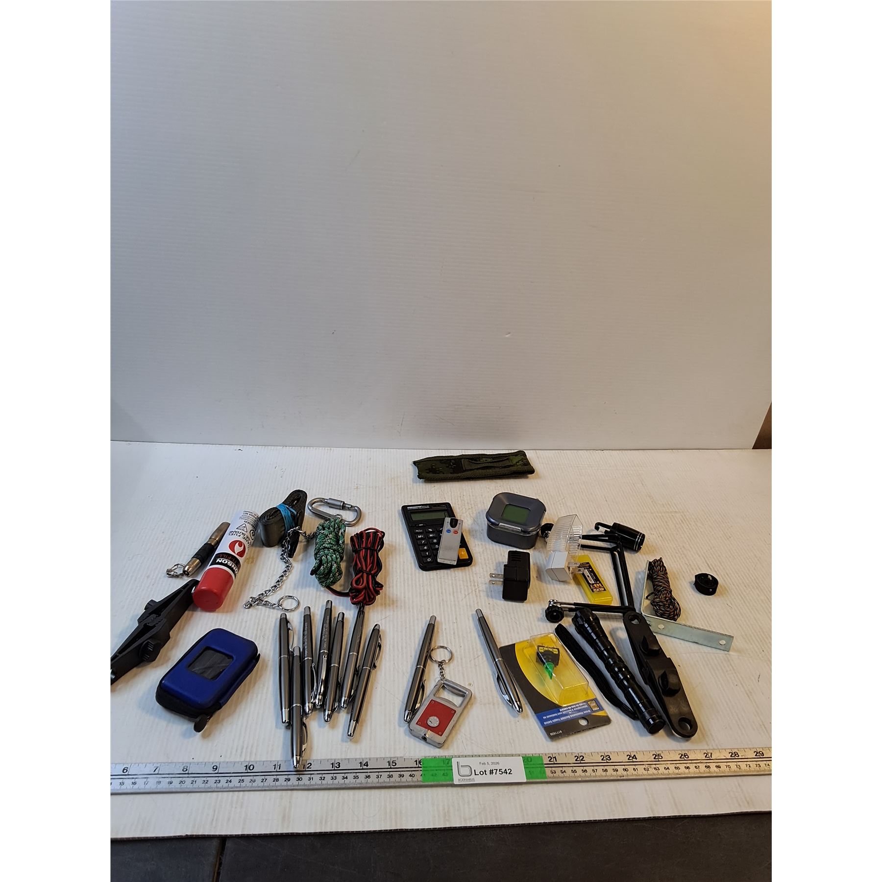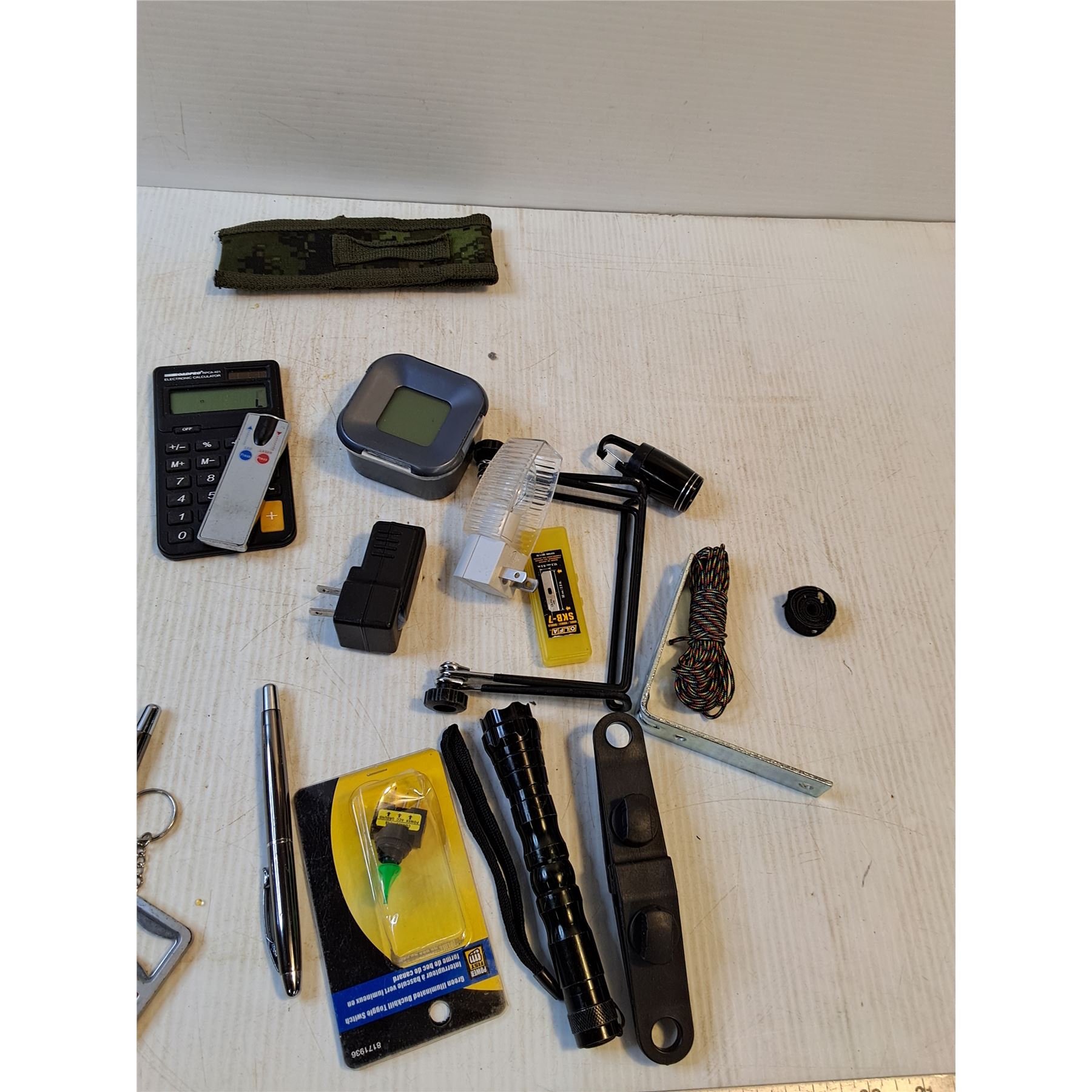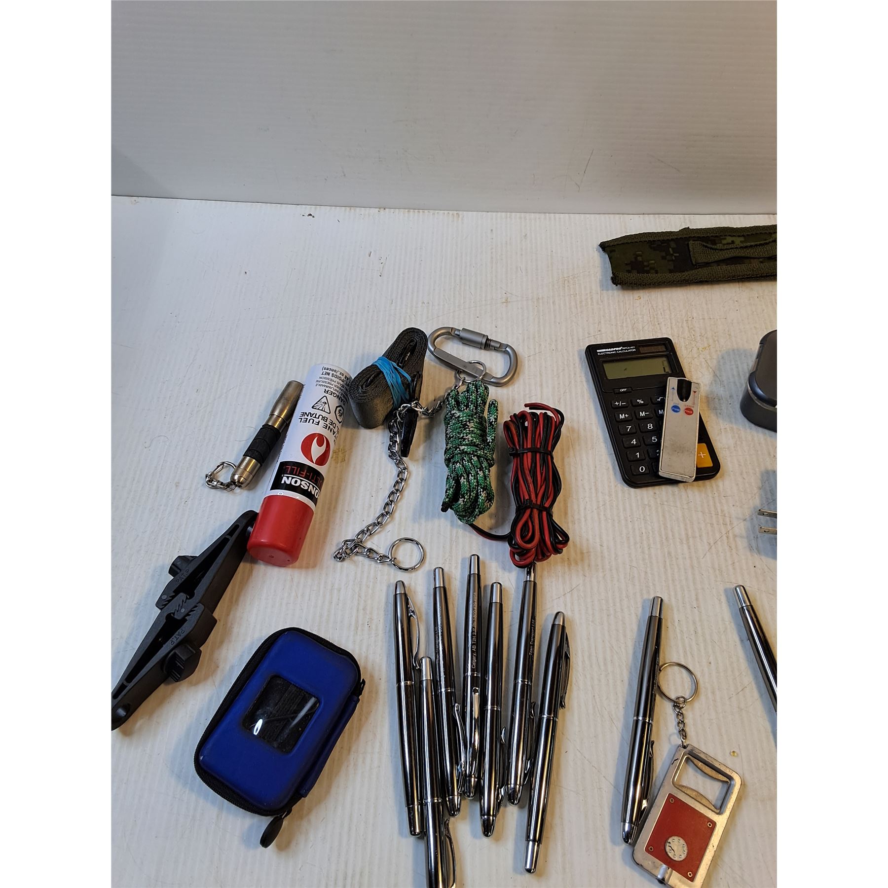 Flashlight, Pens, Calculator, Nylon Rope, Carabiner With Chain, Misc ( everything as is)
