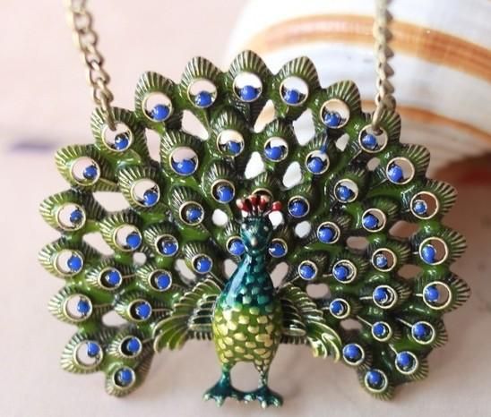 Flashy Bronze and Multicolor Enamel Peacock Necklace. Pendant measures approx 2 inches wide x 2 inches width. Chain measures approx 29 inches.