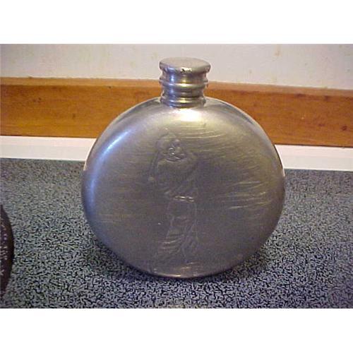 Flask,embossed with golfer on one side; 3.5 X 1.25 diameter; bottom, Pinder Bros., English Pewter, Sheffield, England; some denting but very useable, screw top