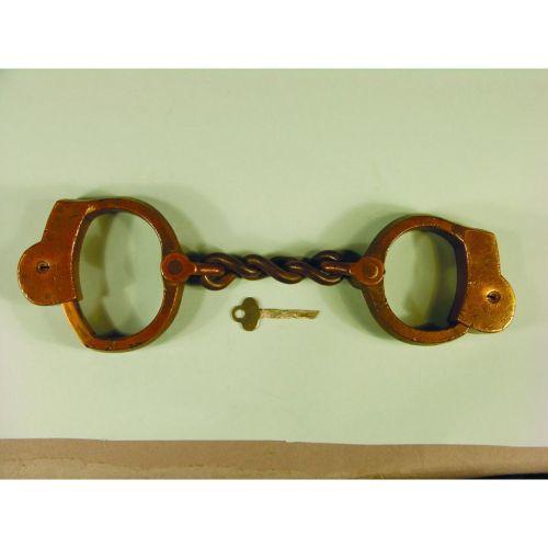 Flat Key Handcuffs, brass, unknown maker, stamped # 14. Excellent condition, with key.