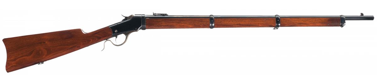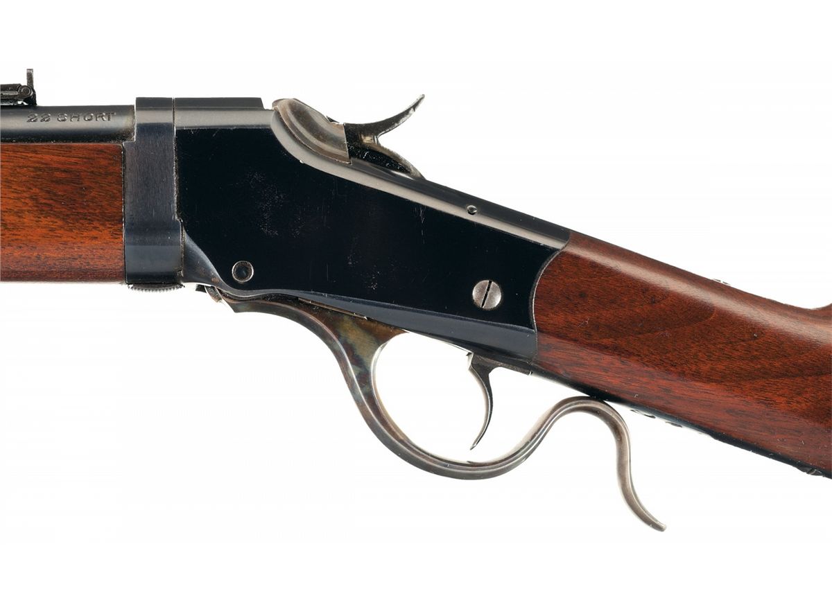 Manufactured 1918 this is a mint example of a rare special order Winchester Model 1885 Low Wall Winder Takedown Musket. The included factory letter confirms the takedown musket configuration, caliber, 30 inch No. 1 barrel and 44-A rear sight. The rifle was received in the warehouse on January 17, 1818 and shipped from the warehouse on January 22, 1918. The letter also states "the Winchester Archives indicates that only five arms of this type were made." The rifle is equipped with a standard blade front sight and folding ladder rear sight. The left side of barrel is marked with the two line Winchester address/patent dates and the caliber designation "22 SHORT" at the breech. The Winchester oval proof is marked on top of the barrel and receiver at the breech. The three line Winchester patent date, trade mark is stamped on the upper tang. Blue finish with casehardened hammer, breech block and lever, and mounted with a smooth full walnut Model 1873 Musket style forearm and straight grip stock with a steel carbine style buttplate and sling swivels.