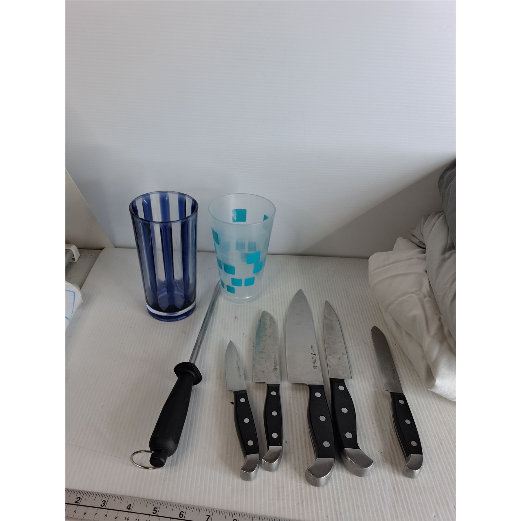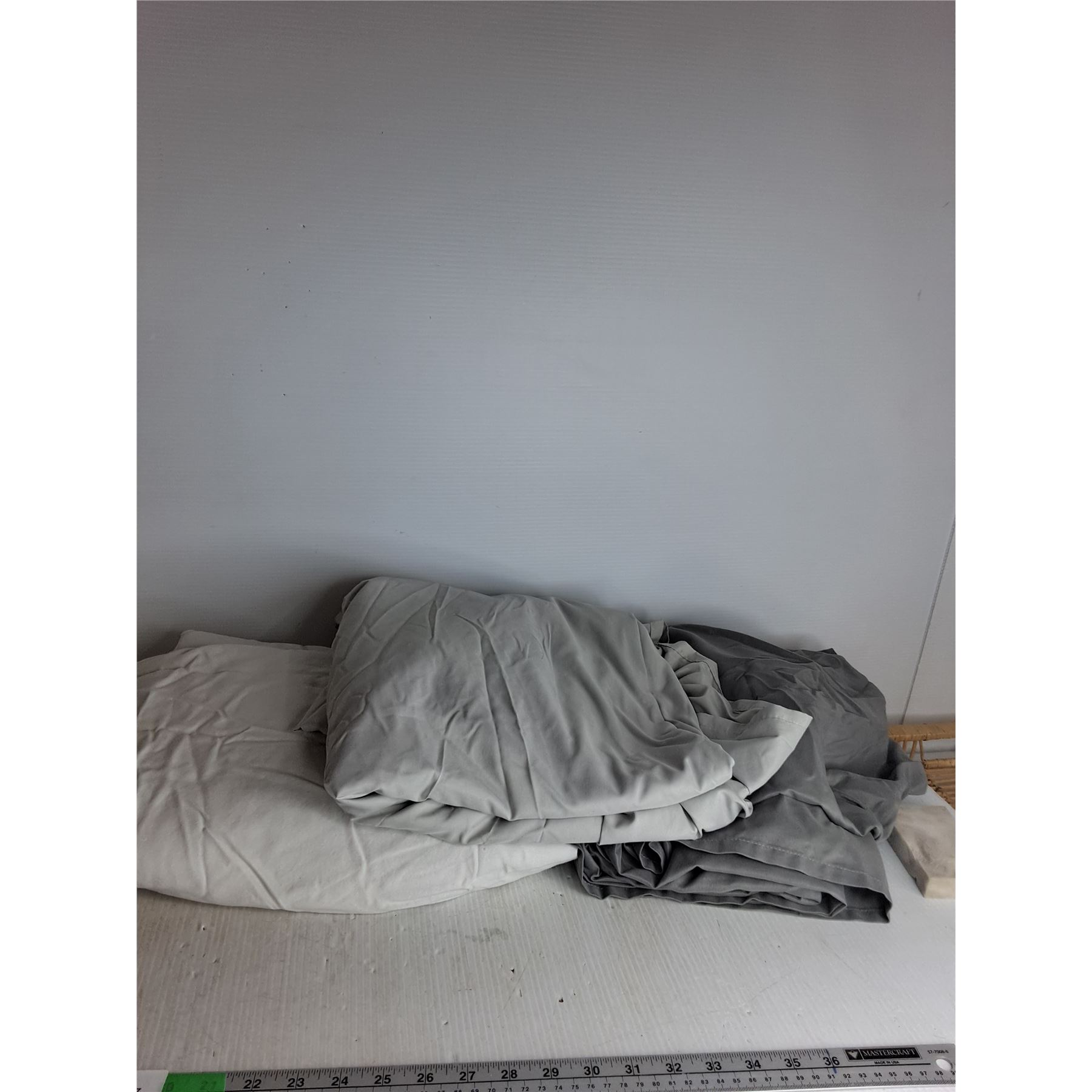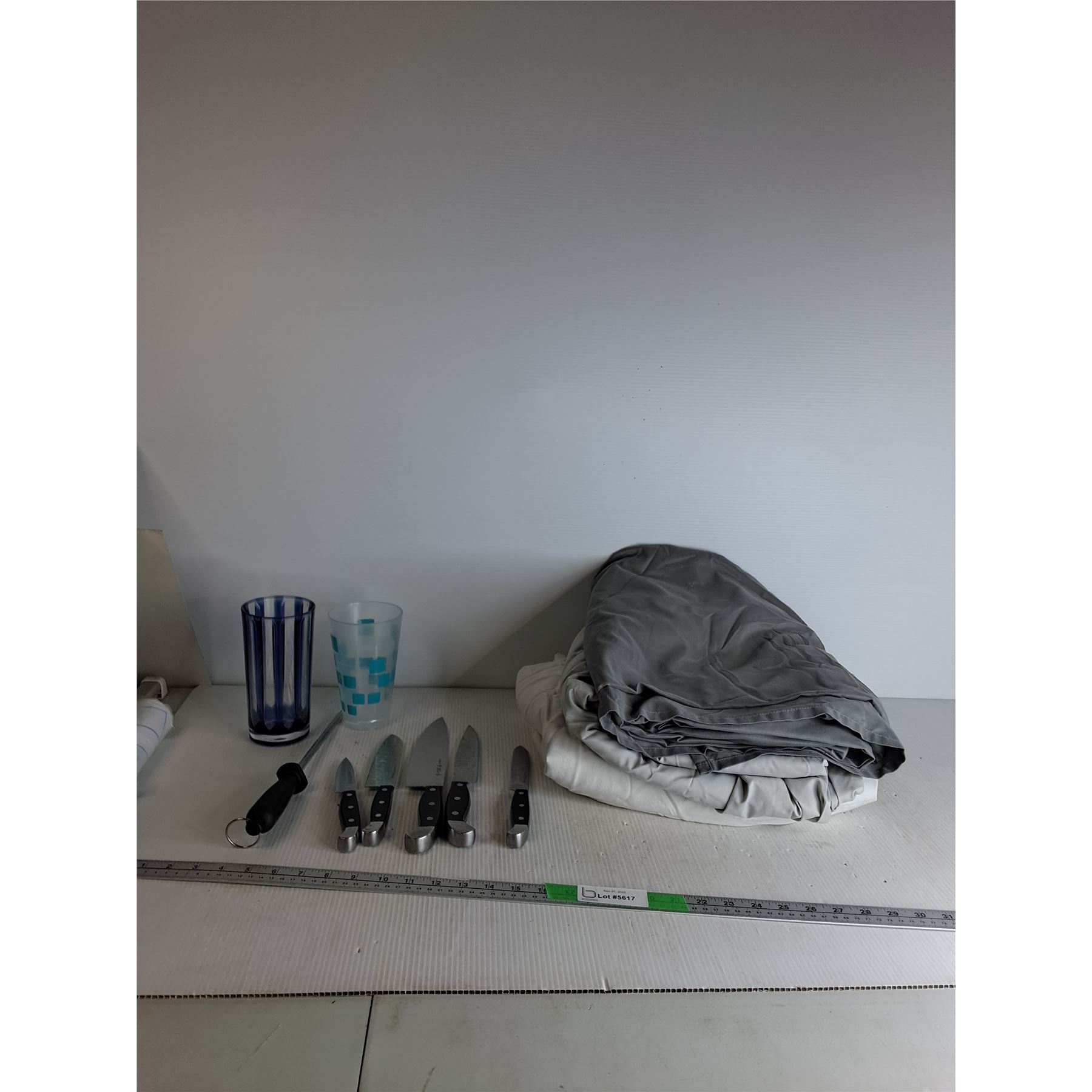 Flat Sheet ( Approx 100"x74"),(2) Flat Sheet Grey (appears to be a double), Kitchen Knife Set,Misc