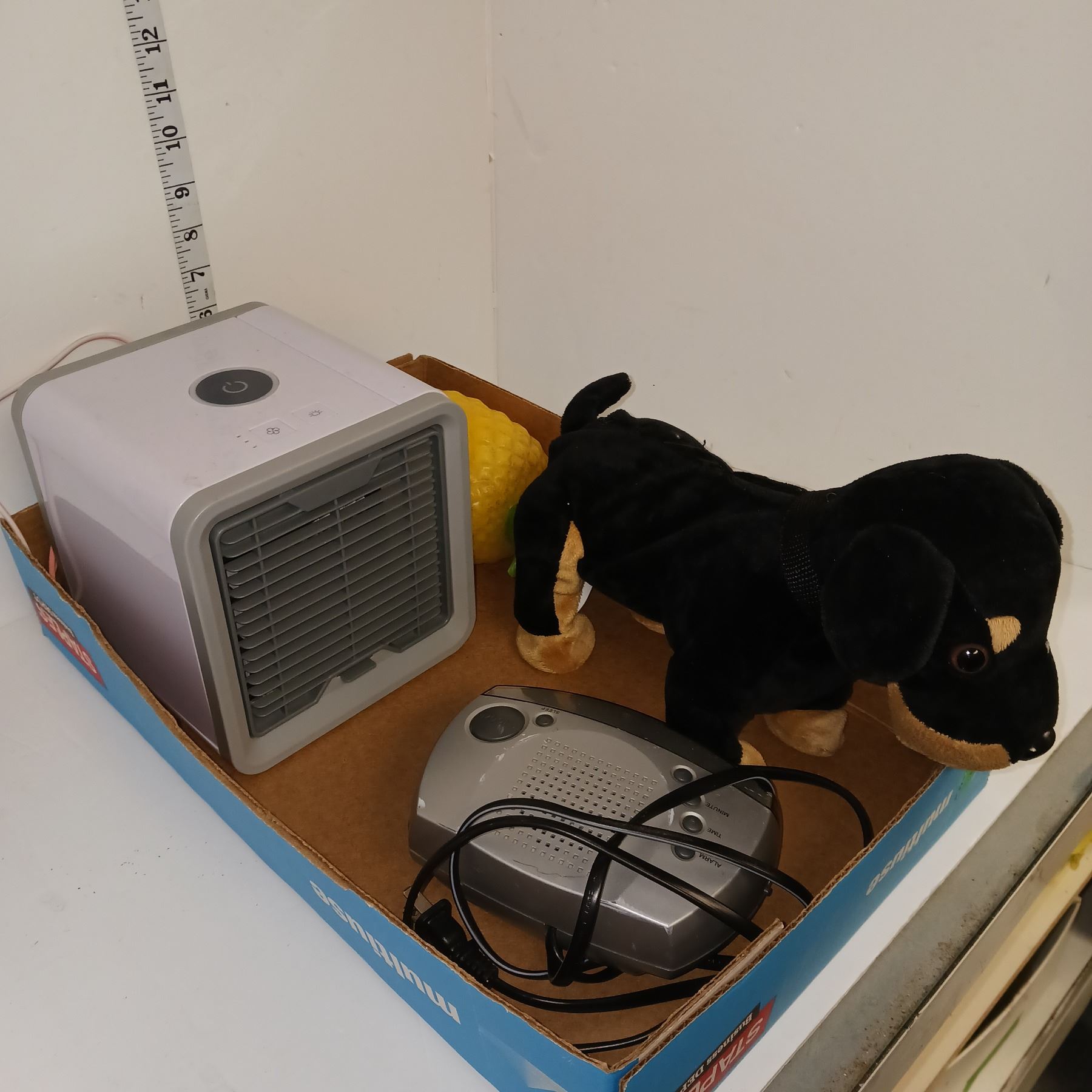 Flat of Estate Items - Mini Air Conditioner, Clock, Moving Toy Dog, Clock + Pineapple Candle