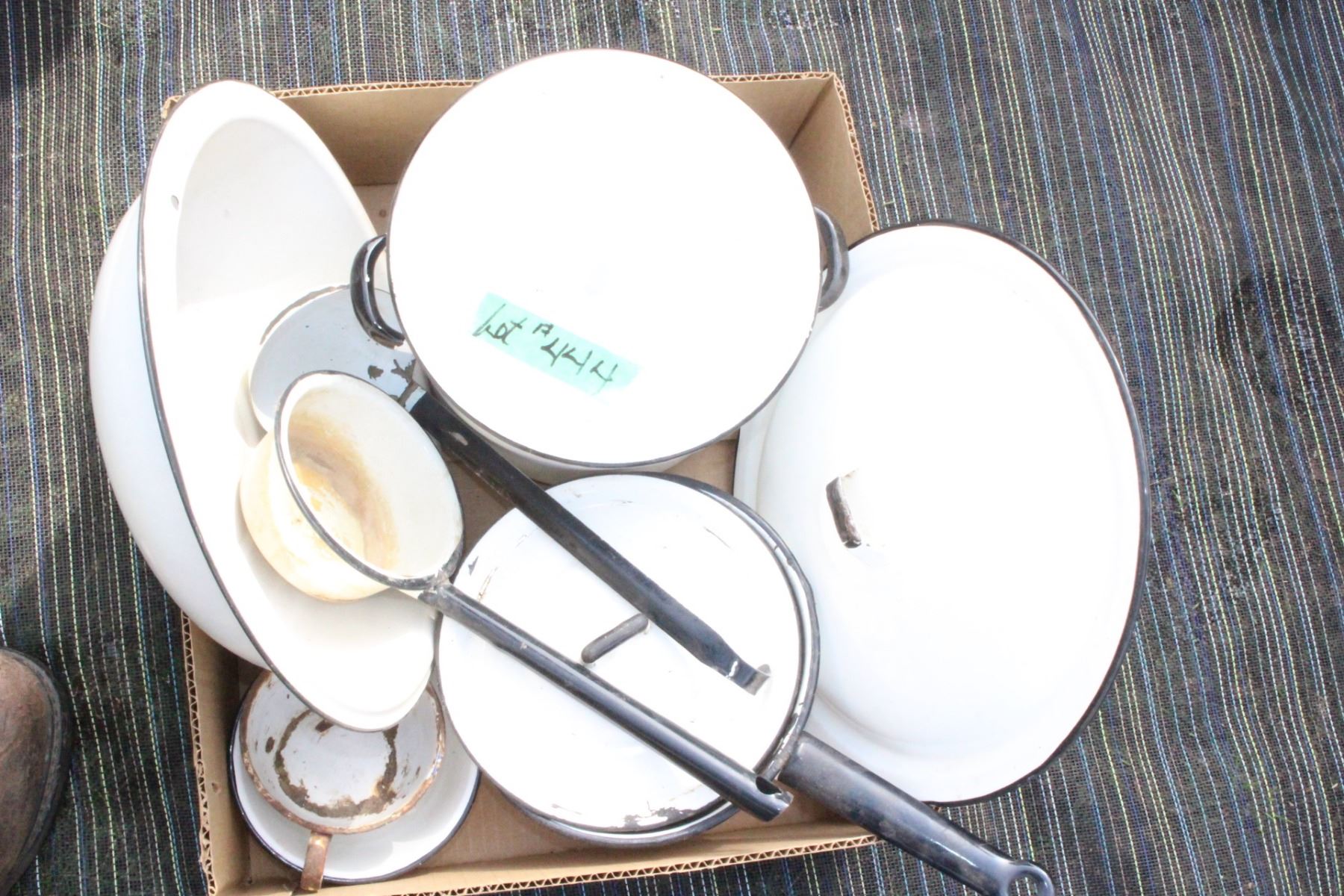 Wash Basin, 2 Dippers, 2 Pots, 3 Lids, a Cup and a Bowl